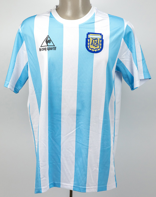 Maradona - Trikot | Schönes Retrotrikot der argentinischen Natinonalmannschaft von der Fußball-WM 1986 mit der Rückennummer "10". Hersteller: Le Coqsportif, ca. 2005. Mit Originalsignatur von Diego Maradona auf der Rückseite!!! Mit COA von "Fanatics".