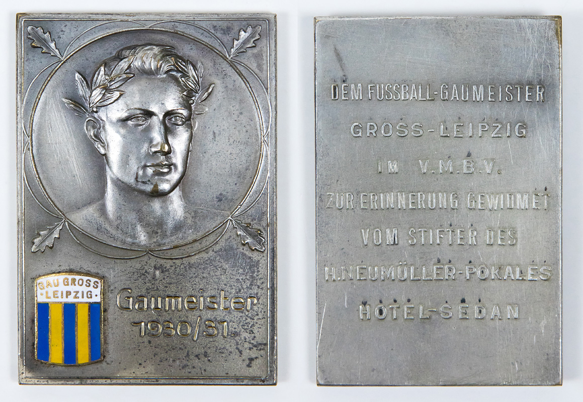 Leipzig - Siegermedaille 1931 | Siegerplakette des Fußballbezirks "Gau Gross Leipzig" mit der Gravur "Gaumeister 1930/31" für den Sieger FC Sportfreunde Leipzig. Inschrift auf der Rückseite: "Dem Fussball-Gaumeister Gross-Leipzig im VMBV zur Erinnerung gewidmet vom Stifter des H.Neumüller-Pokales Hotel-Sedan". Bronze, versilbert, mit aufgestztem farbig emaillierten Logoe des Gaues Gross Leipzig, 6x4,2 cm.