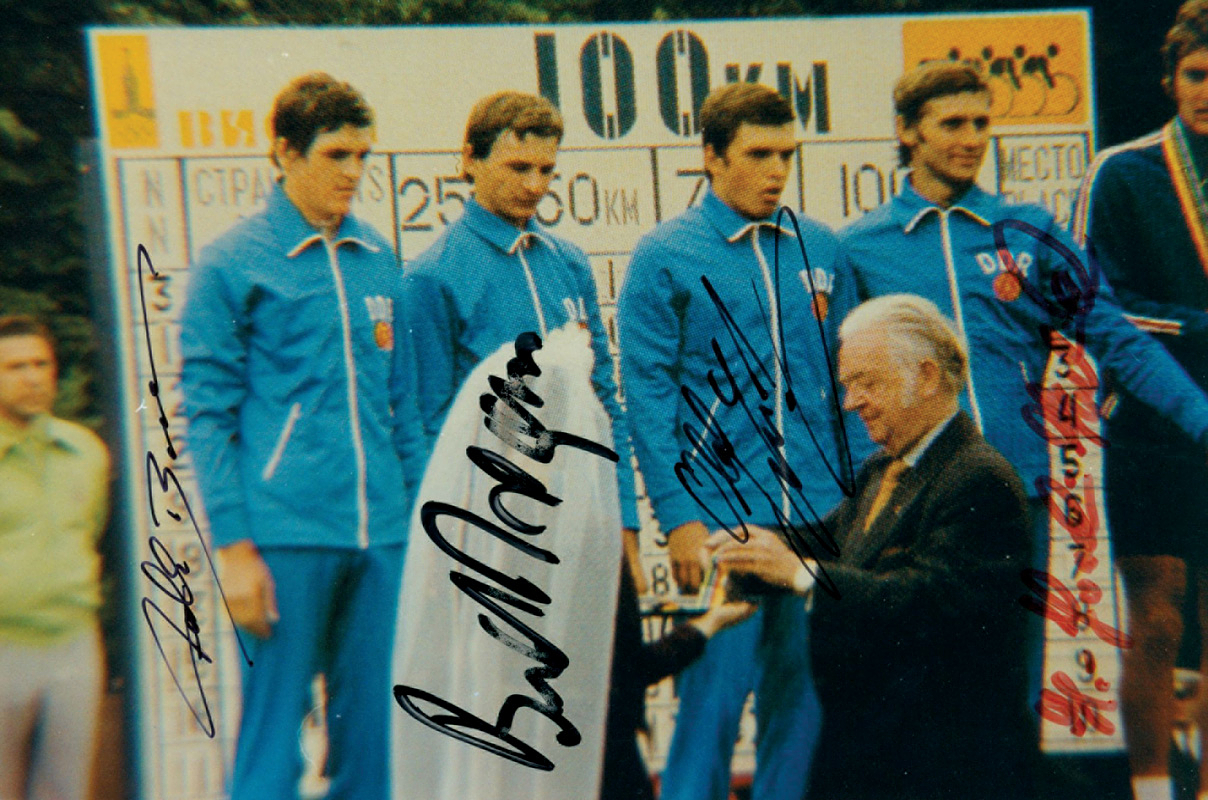 DDR OSS1980 Radsport | Silbermedaille für die DDR im Radsport bei den Olympischen Spielen 1980 im Mannschaftszeitfahren. Farbreprofoto mit den original Signaturen von Falk Boden (3facher Weltmeister), Bernd Drogan (3facher Weltmeister), Olaf Ludwig (Gold 1988; Grünes Trikot Tour de France 1990), Hans-Joachim Hartnick (Sieger Friedensfahrt 1976 + Weltmeister 1979). KOMPLETTES TEAM. 18x12,5 cm