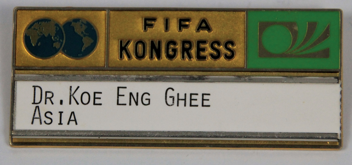 Teilnehmerabzeichen 1974 | Teilnehmerabzeichen „FIFA Kongress 1974“ in München. Mit Namensschildchen aus Karton "Dr. Koe Eng Ghee Asia". Bronze, vergoldet, mehrfarbig emailliert, 7x3,2 cm.