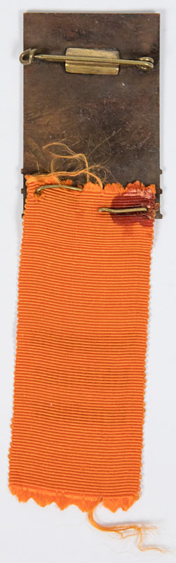 Teilnehmerabzeichen 1952 | Teilnehmerabzeichen „Yletsurhellu Athletisme Entrainuer“ (Trainer Leihtathetik) für die Olympischen Spiele Helsinki 1952. Bronze, mehrfarbig emailliert. Mit orangenem bedrucktem Seidenband, 11,5x3,3 cm.