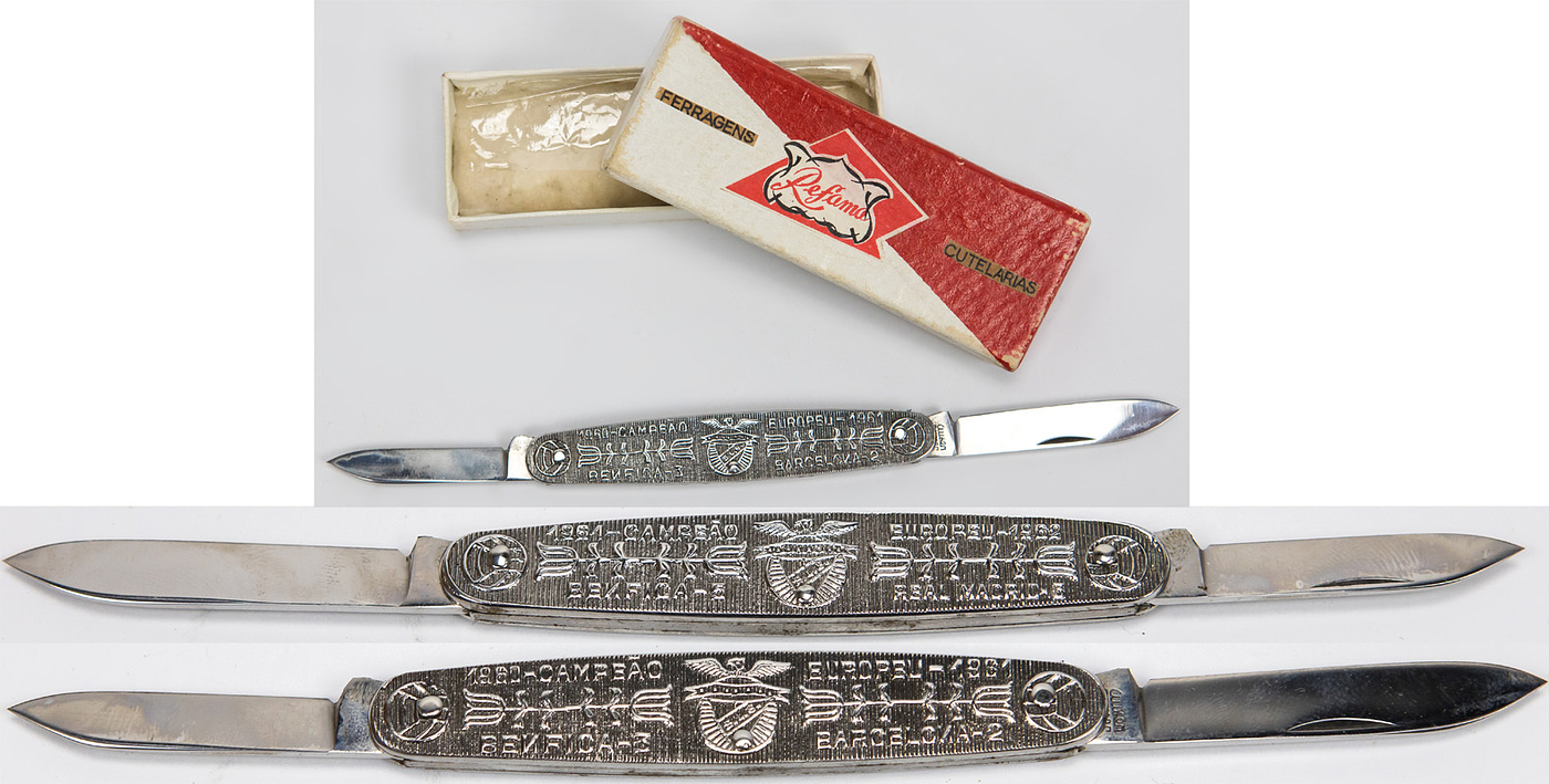 Lissabon,Benfica - Taschenmesser | Verchromtes Taschenmesser zur Erinnerung an die beiden Europapokaltriumphe von Benfica Lissabon. Beide Messerseiten mit Inschriften und Vereinslogo von Benfica: „1961/1962 Campeao Europeu Benfica - Real Madrid 5-3“ 2) „1960/1961 Capeao Europeu Benfica - Barcelona 3-2“. 8,5x1,8cm. In original Pappbox -- -Guttmann Nachlass 2001 Nr. 261