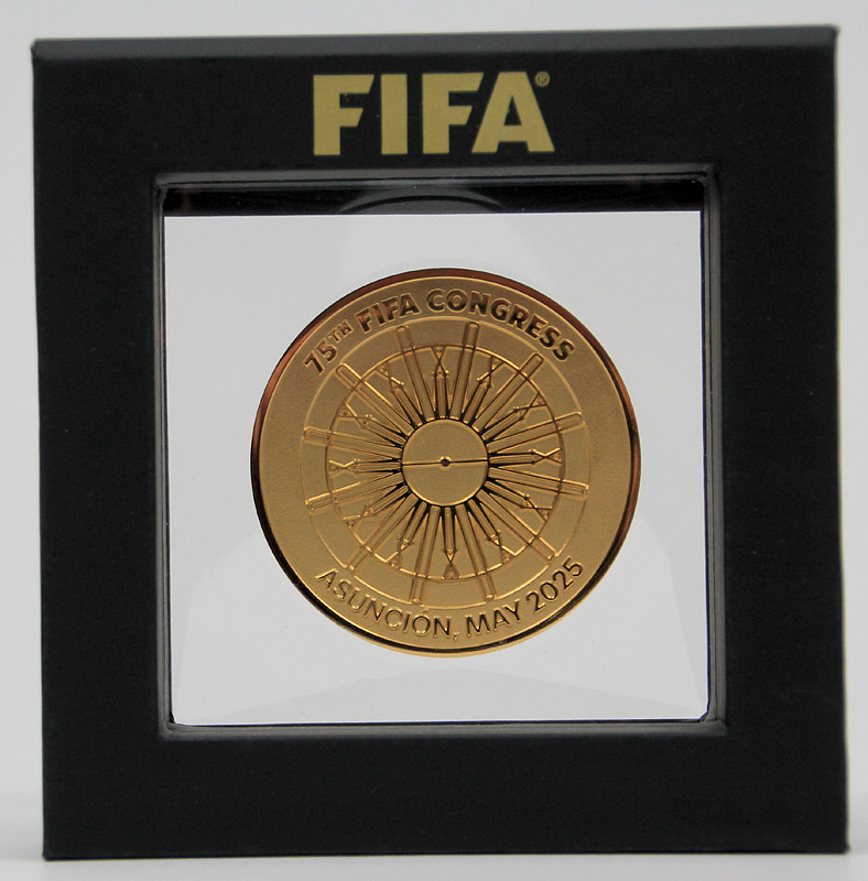 FIFA-Medaille 2025 | Vergoldete Teilnehmermedaille zum 75th FIFA Congress. Asuncion May 2025. 5 cm. Im original Etui.