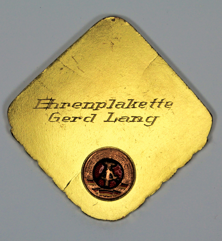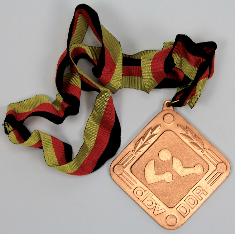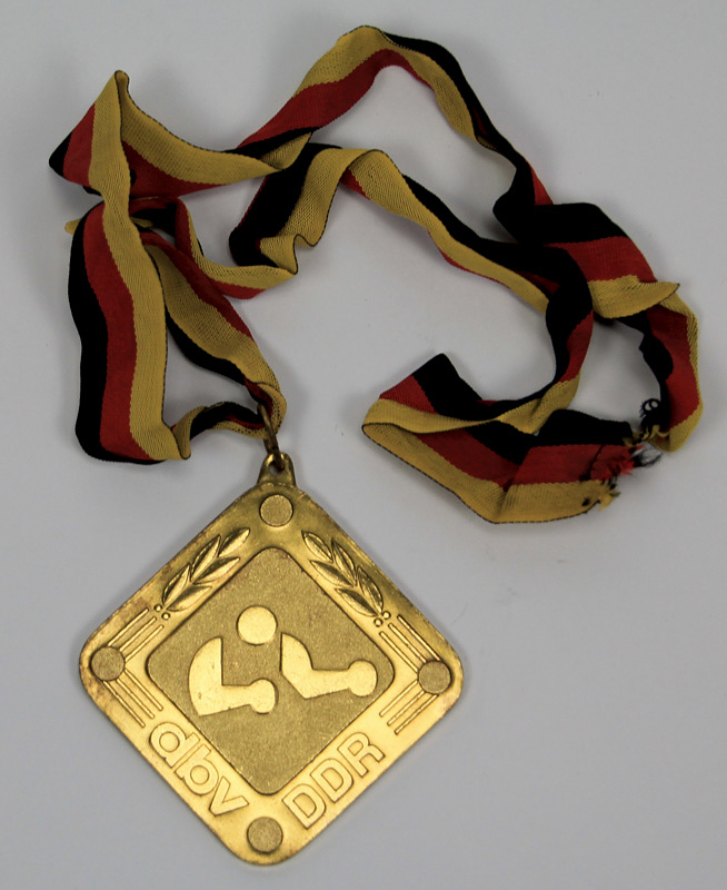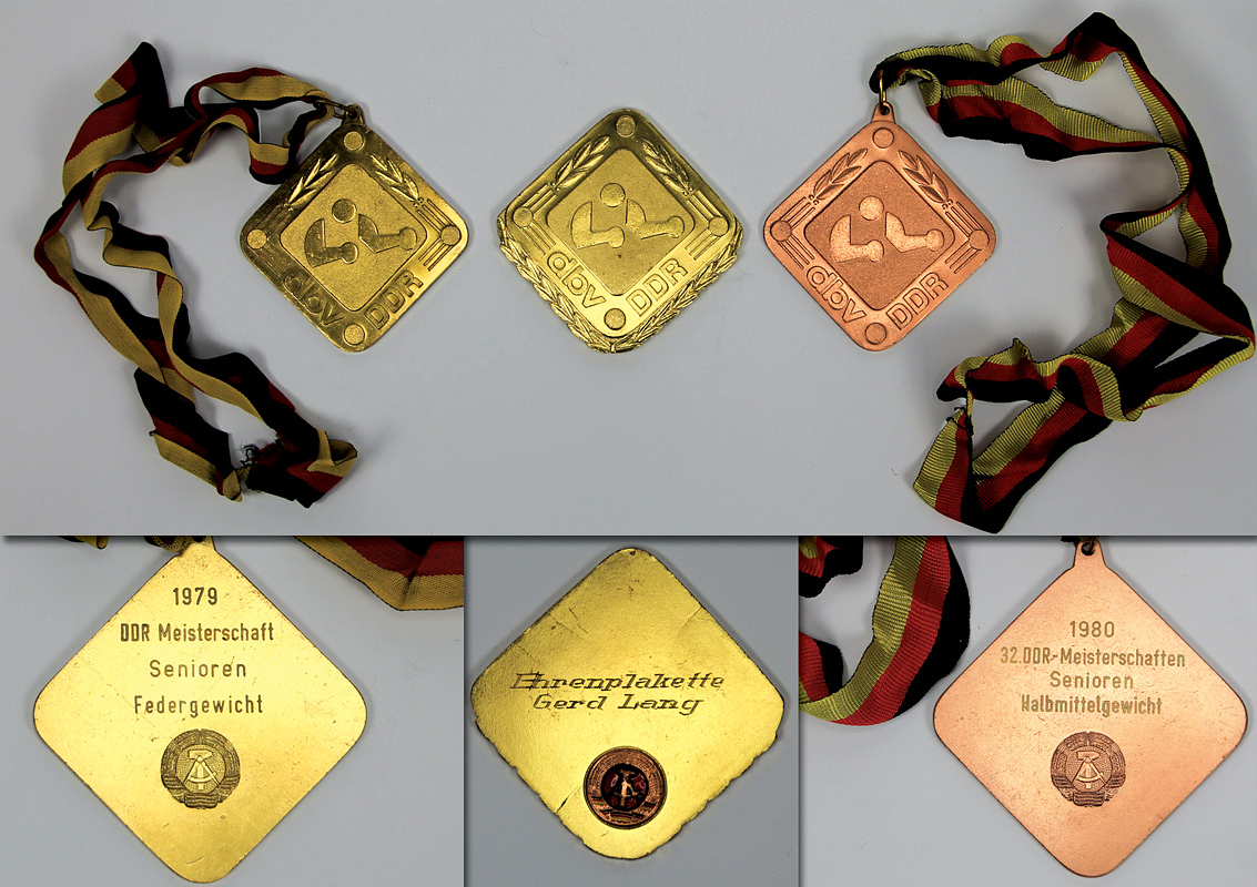 Siegermedaille 1979 + 1980 | Zwei Siegermedaillen der DDR Boxmeisterschaften 1979 + 1980: 1) Goldmedaille mit der Aufschrift "1979 DDR Meisterschaft Senioren Federgewicht" mit Seidenband. 2) Bronzemedaille "1980 DDR Meisterschaft Senioren Halbmittelgewicht" mit Seidenband. Je 8x8 cm n original Box. Dabei: Ehrenplakette des DBV - DDR mit rückseitiger Gravur "Ehrenplakette Gerd Lang". Bronze vergoldet mit aufgesetztem, emaillierten Staatswappen, 8,5x8,5 cm.