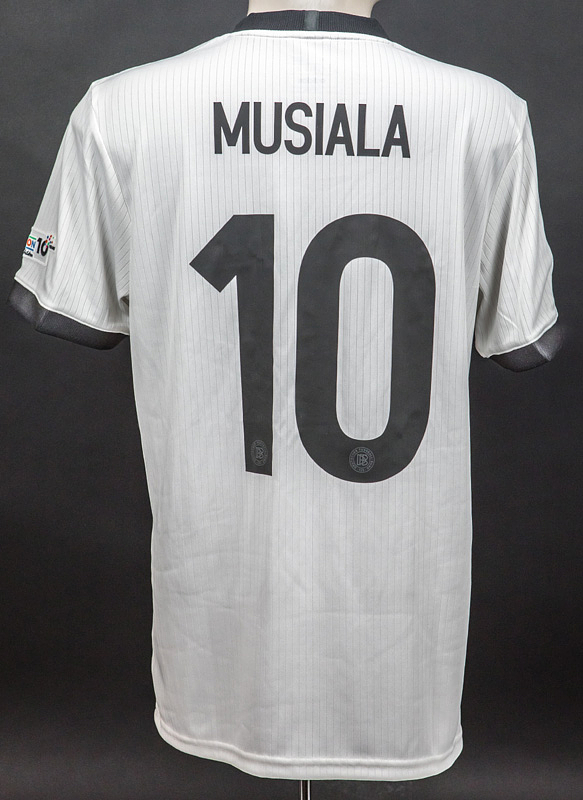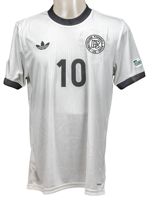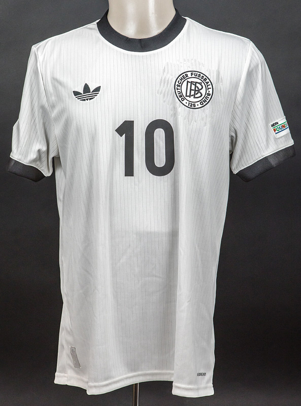 2025 match worn football shirt Germany Musiala - Original match-worn/issued Germany shirt with the number 10. Worn by Jamal Musiala in the UEFA Nations League semi-final between Italy and Germany (1:2) on March 20, 2025 in Milan. This special shirt commemorates 125 years of the German Football Association. Status: AAB. This shirt was only worn in the two matches against Italy (March 20 and 23, 2025)! (probably caused by strong pulling on the shirt by an Italian player).---Short-sleeved jersey; size M; DFB special patch "125 German Football Association" (embroidered and sewn), embroidered adidas logo; rubberized player name and number (front and back); embroidered German flag in the collar; jersey with UEFA Nations League patch and UEFA Foundation for Children "10 Years" patch; adidas Aeroready. And sewn-on white adidas shield with embroidered adidas logo, DFB logo, and "Founded 28.01.1900" lettering. Jersey comes from a DFB employee.--The German Football Association is celebrating ist 125th anniversary this year and has launched a special jersey for the occasion: the DFB Anniversary Jersey 125 Years. This jersey combines the legacy of all previous Germany jerseys and is a tribute to the long history of German football. The DFB Anniversary Jersey 125 Years is characterized by a classic and understated design. The main color is cream white, combined with a black collar and black cuffs. The historical elements are particularly striking. The jersey features the Adidas Trefoil logo, reminiscent of earlier designs. The first DFB logo from 1900 has also been incorporated in a special 125th anniversary version. An embossed eagle is incorporated behind the classic crest as a symbol of German football tradition. The German flag is a subtle detail on the inside of the back collar. A museum piece! Condition: A-