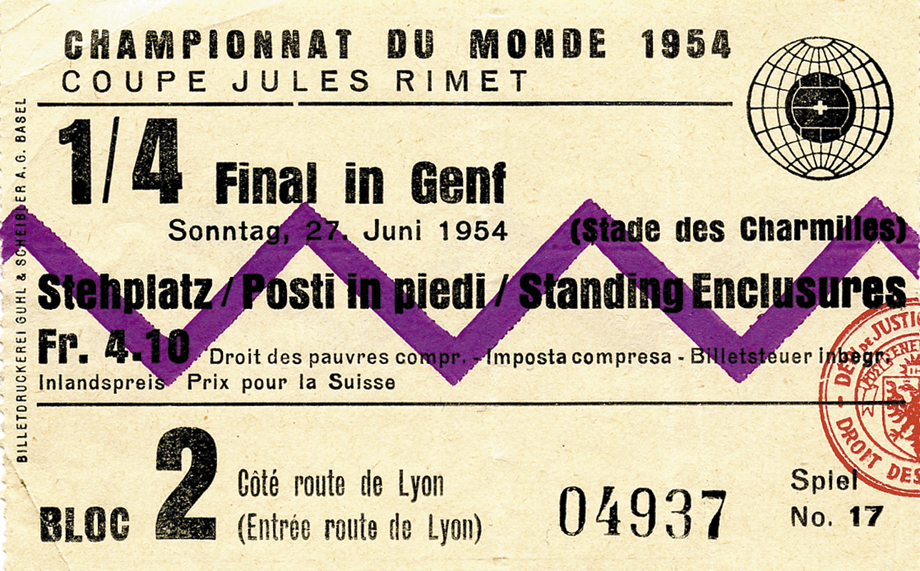 FIFA World Cup 1954. Ticket Yougoslavia v Germany - Qarter Final (2-0). Geneve, June 27th, 1954. Size 9.5x6cm. Condition: B