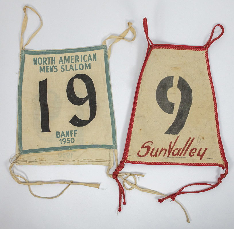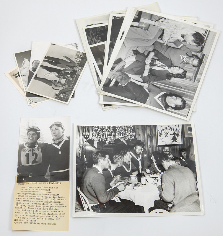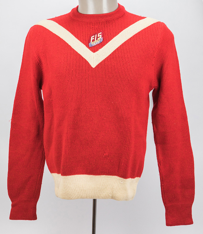 FIS Alpine World Championships Aspen 1950 - Collection of the Swiss bronze medalist in downhill at the 1948 Olympic Games Ralph Olinger (1924-2006) and participant in the 1950 Alpine World Championships. 1) Official ski sweater of the Swiss team for the 1950 World Ski Championships in Aspen. Worn by Olinger at the competitions in Aspen. Red and white wool with applied embroidered logo "FIS Aspen 1950". The lettering “OLI” for Olinger is inserted at the top of the collar. Size approx. 50. Small damage, pulling threads. Coat of arms of Switzerland was removed by olinger. 2) Start number with the number "9" and the inscription "Sun Valley" for the Harriman Cup 1950 (was held from 1937 to 1965. At that time it was one of the most important and demanding ski races in the United States and, in addition to the strongest North American ski racers, also regularly featured the best athletes from Europe), linen 29x25 cm. 3) Start number with "19" for "North American Men's Slalom Banff 1950". Linen, 25x24 cm. 4) 16 B/W photos from the FIS Ski World Cup 1950 with mainly Swiss participants and a photo from the 1948 Olympic Games (Olinger + Moliter), 25x20.5 to 15x10.5 cm --The ski sweater is almost identical to the official ski sweater of the Swiss Alpine Olympic team from 1948, which only had white sleeve stripes. The athletes wore these ski sweaters during competitions as well as in their free time! Olinger wore both starting numbers at races in North America in 1950. At the FIS Ski World Championships, his best placement was 9th place in the downhill. In the black and white photos you can see Olinger wearing this ski sweater! --The conigner get all pieces directly from Ralph Olinger's estate Condition: B