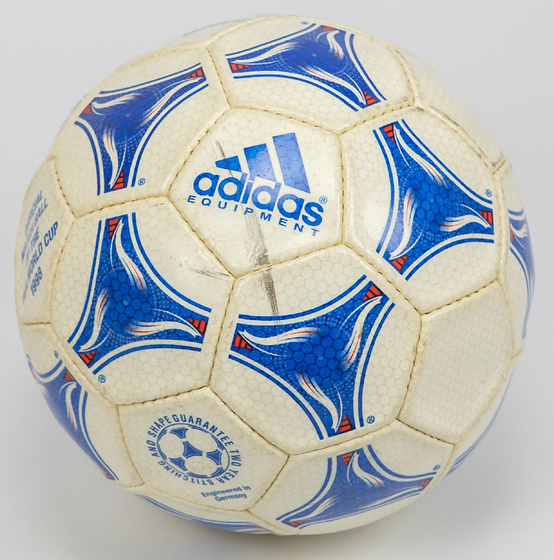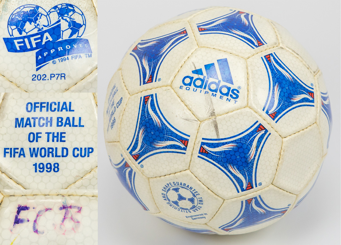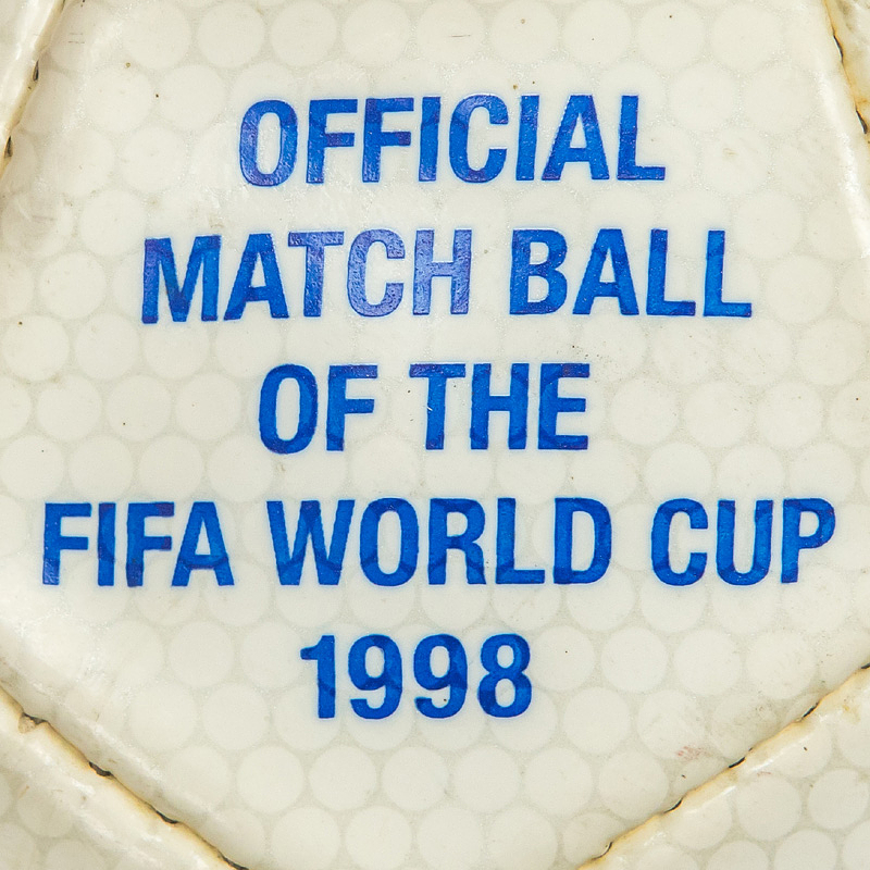 Football match Ball 1999 Bayern Munich v Eindhove - Original match ball from the Champions League match between Bayern Munich and PSV Eindhoven (2-0) on September 15, 1999 in Munich. Leather ball "Adidas Tricolore. Official Match Ball of the 1998 World Cup." With handwritten note from the referee "FCB." With play wear. Condition: AAA --The ball comes from the collection of the French referee of this match, Gilles Veissiere. Condition: A-B