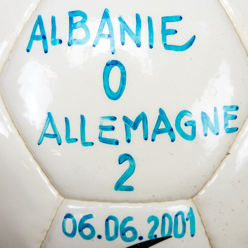 Football match Ball 2001 Germany v Albania - Original match ball from the international match between Albania and Germany (0:2) on June 6, 2001, in Tirana. A qualifying match for the 2002 FIFA World Cup. The leather ball is "Tramondi F.SH.F. 1930." Handwritten by the referee, plus original signatures by the assistant referees. With play wear. Condition: AAA --The ball comes from the collection of the French referee of this match, Gilles Veissiere. Condition: A-B