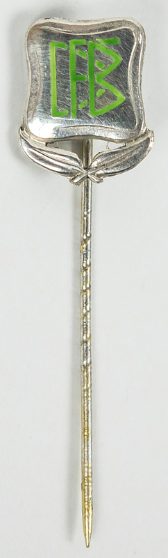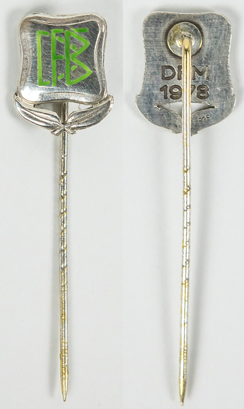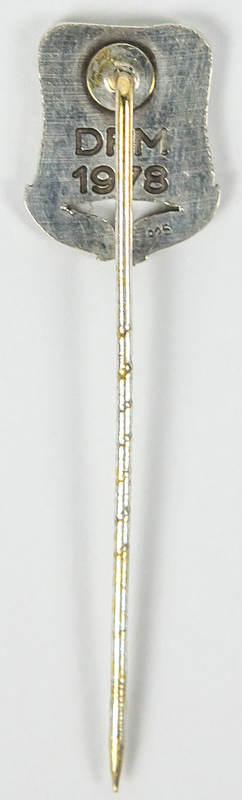 German Football. Championships Pin 1978 - Official DFB championship pin for second place in the German Football Championship 1977/78 for Borussia Mönchengladbach. Silver (hallmarked 925), green enamel. Back with inscription “DFM 1978” (German soccer champions). 1x1.3cm. --Was issued to the players of Borussia Mönchengladbach who finished second in the Bundesliga final table in 1978. And thus German runner-up behind Bayern Munich (received this gold-plated badge) became a rarity!!!! Approximately 30 of these needles were issued! Excellent (EF). Condition: A