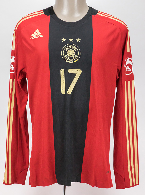 match issued football shirt Germany 2008 - Original match-issued Germany player jersey with the number 17. Designed for Per Mertesacker on May 27, 2008, in a friendly against Belarus. Germany - Belarus 2:2. Mertesacker played in a short-sleeved jersey and is a 2014 FIFA World Cup winner. Status: ABB --Long-sleeved jersey; size L; embroidered association logo and three World Cup stars; rubberized adidas logo, back number, and player name; mesh insert; with adidas patches; adidas formotion clima365. Comes from the collection of a DFB employee. Condition: A