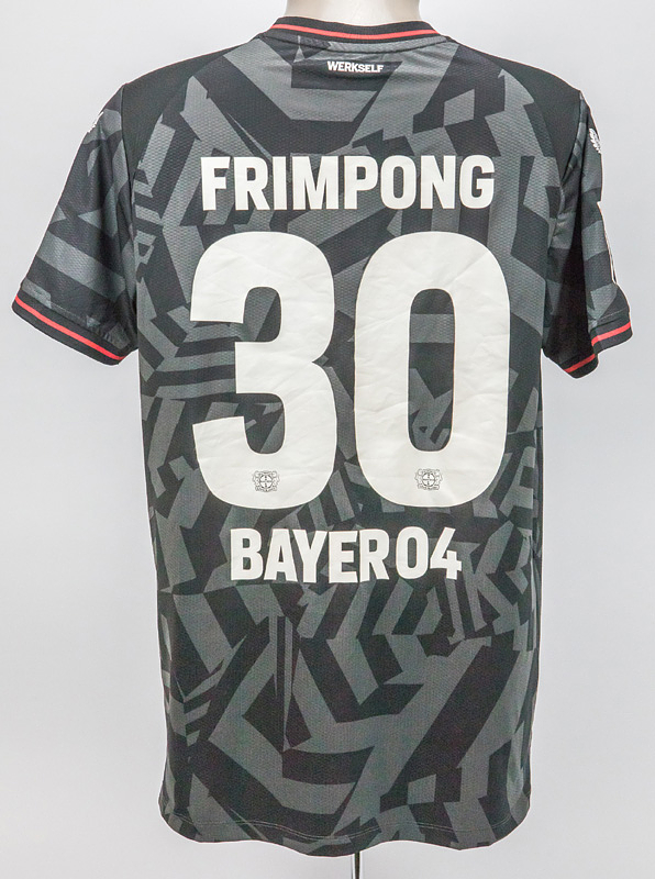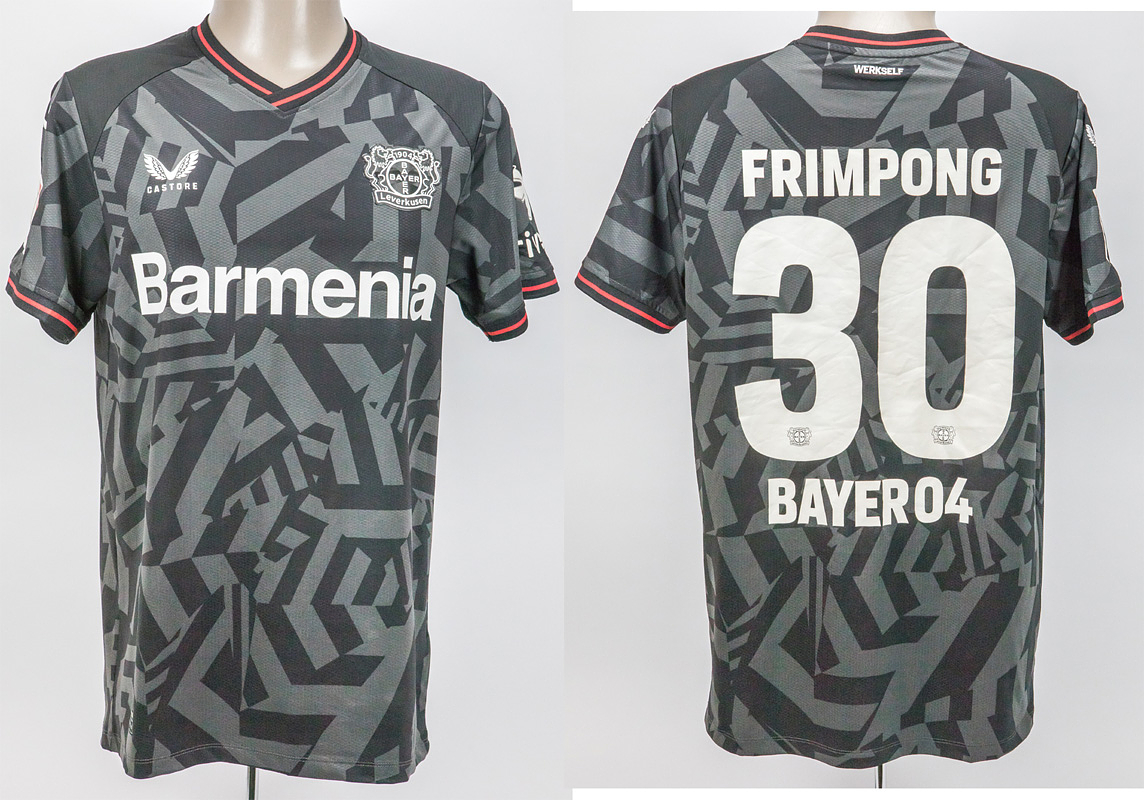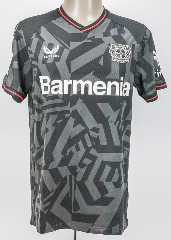 Sorry, no english description is available. ... match worn football shirt Bayer Leverkusen 2023 - Condition: A.....Auswärts-Trikot kurzarm; Größe M; Vereins-Logo und Castore-Logo gummiert; Werbeaufdruck 'Barmenia' gummiert; Spielername, Rückennummer und Schriftzug 'Bayer04' gummiert; Schriftzug 'Werkself' auf Kragenrückseite gummiert; mit BL und trive Patch; Castore. Kommt aus der Sammlung eines Mitarbeiters von Bayern Leverkusen.