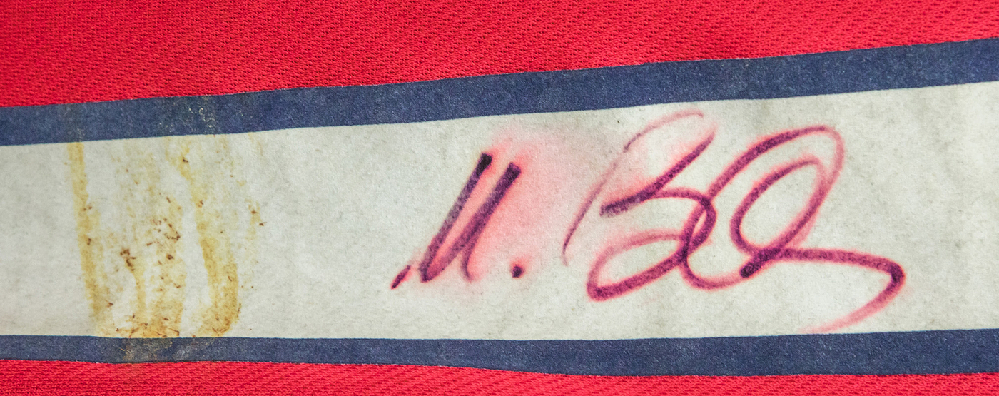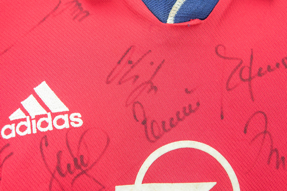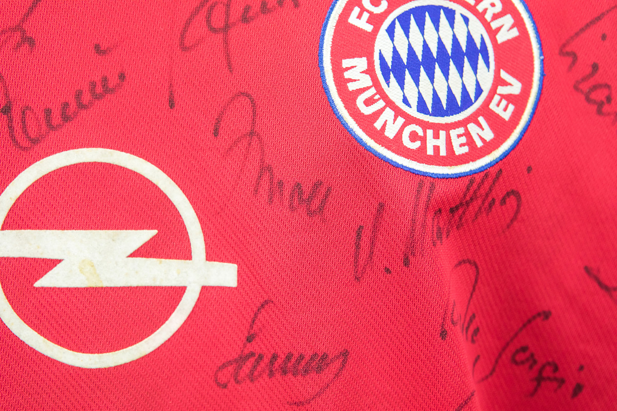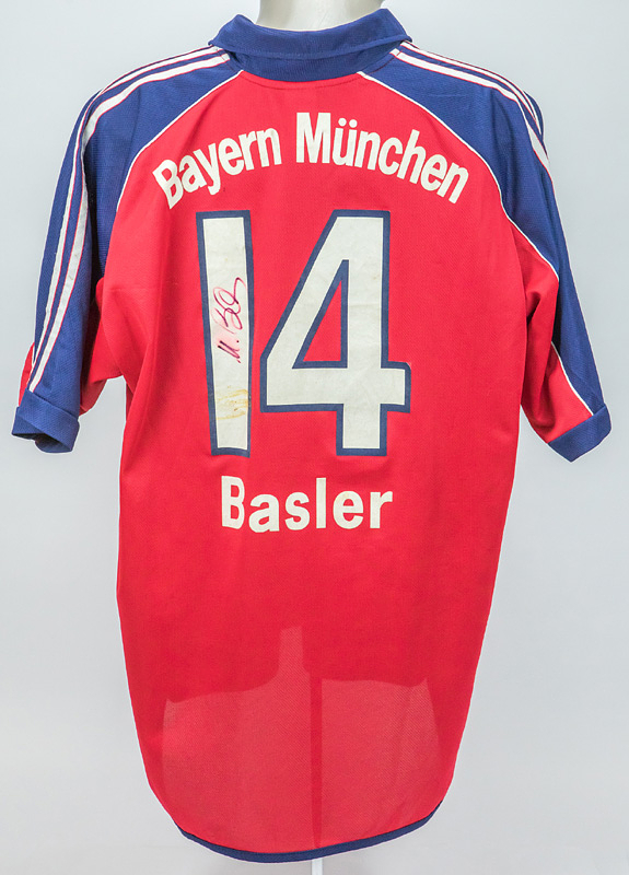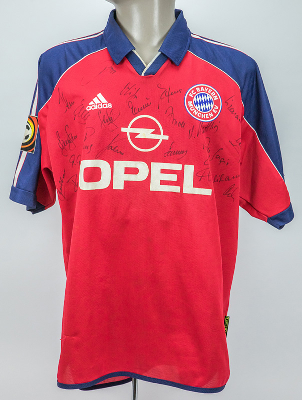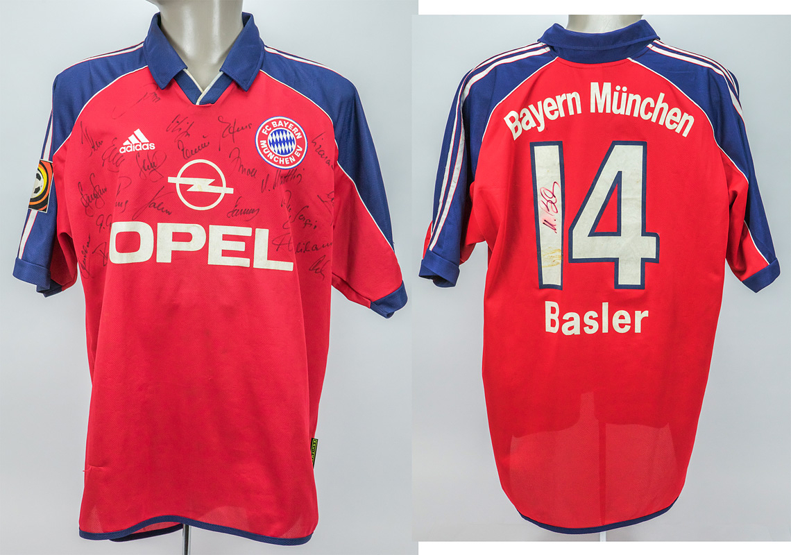 match worn football shirt Bayern Munich 1999/2000 - Original match-worn FC Bayern Munich shirt with the number 14. Worn by Mario Basler in a Bundesliga match during the 1999/2000 season. Basler was the 1996 European Football Champion. The shirt is team-signed (with approximately 23 original autographs on the front and Basler on the back number). Status: ABB --Trikot kurzarm; Größe XL; Vereins-Logo und adidas-Logo gestickt; Werbeaufdruck `Opel' geflockt; Spielername, Rückennummer und Schriftzug 'Bayern München geflockt; Trikot hat Gebrauchsspuren (Flecken); mit BL Patch und equipment Tag; adidas. Trikot kommt aus der Sammlung eines ehemaligen Mitarbeiters von Bayern München Condition: A-