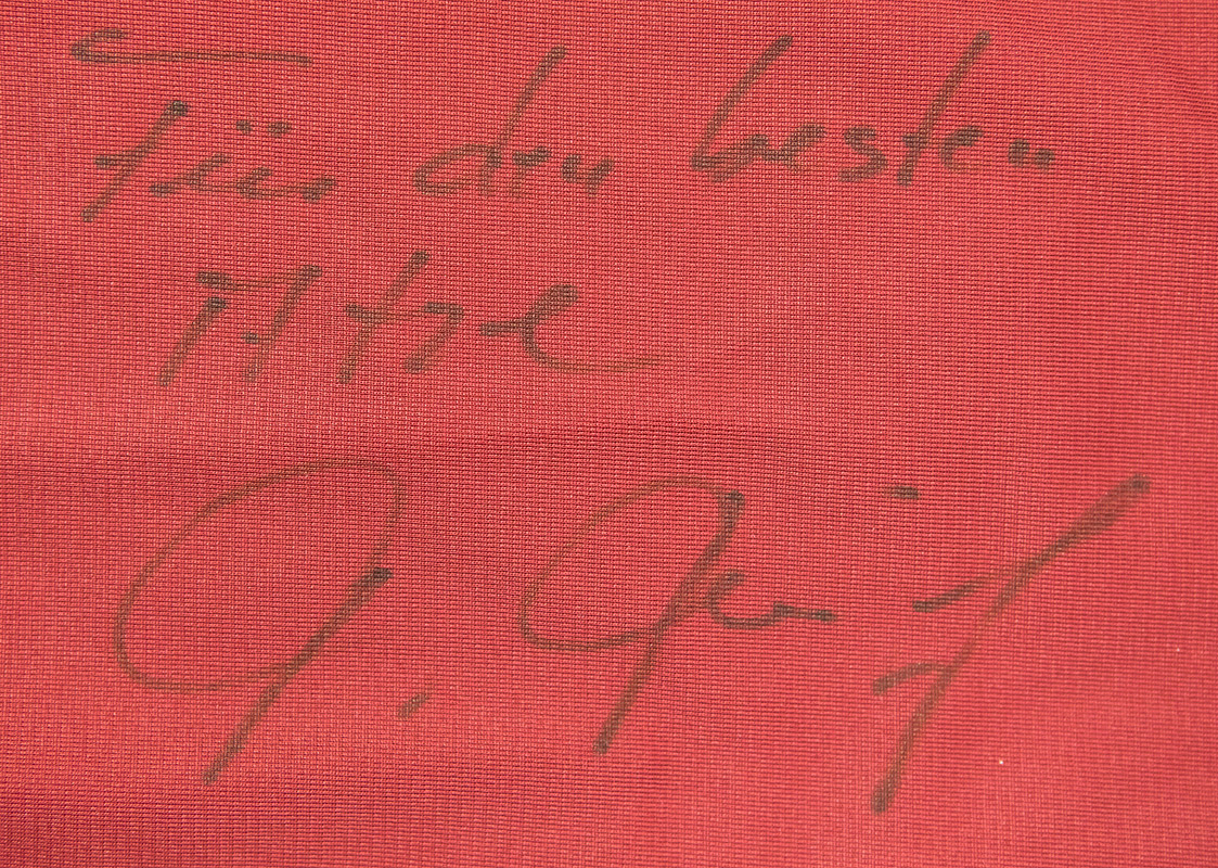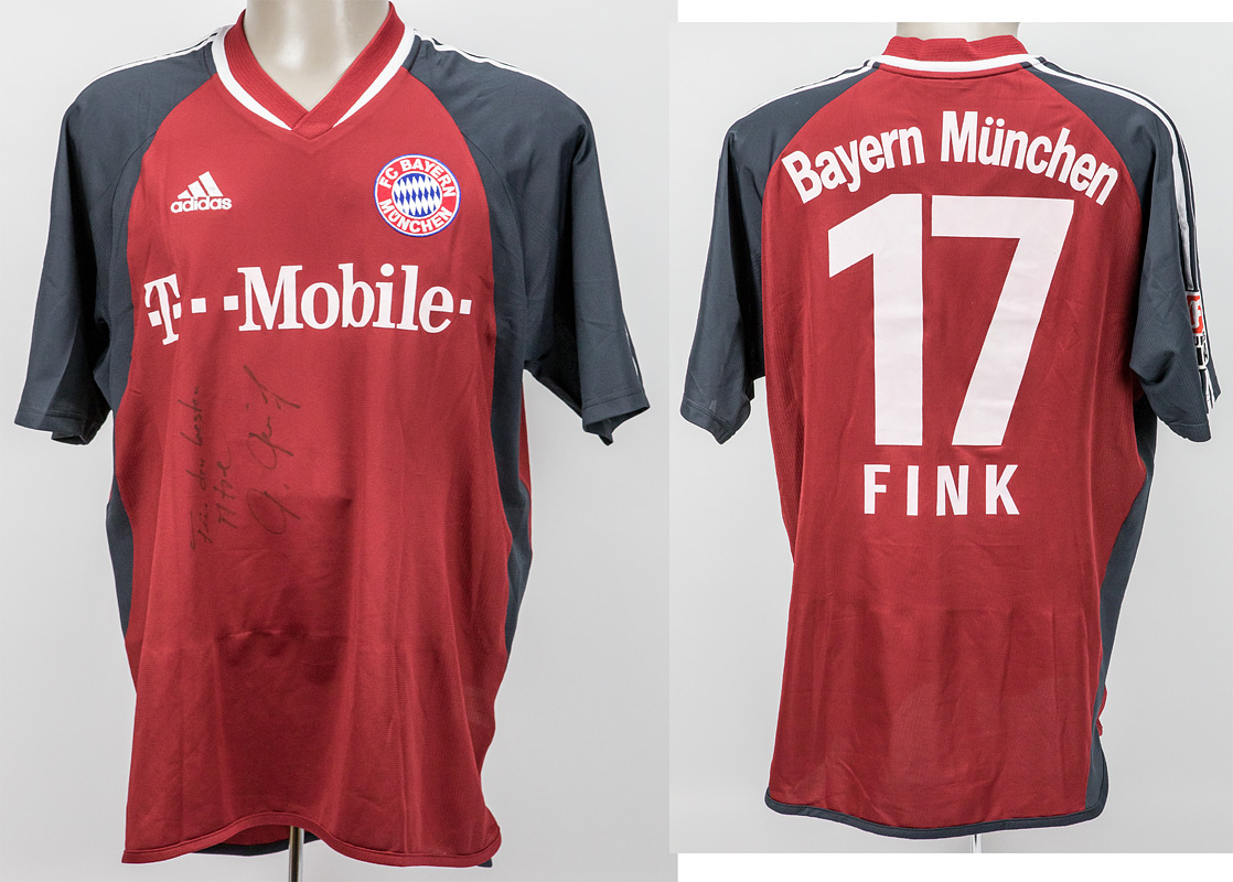 match worn football shirt Bayern Munich 2002/2003 - Original match-worn FC Bayern Munich shirt with the number 17. Worn by Thorsten Fink in a Bundesliga match during the 2002/2003 season. The shirt features Thorsten Fink's original autograph and dedication on the front. Status: ABB --Short-sleeved jersey; size L; embroidered club logo and adidas logo; flocked advertising print "T-Mobile"; gummed player name, number, and "Bayern München" lettering; jersey shows signs of wear (small stains); with BL patch and climaLite tag: adidas climaLite. Jersey comes from the collection of a former FC Bayern employee. Condition: A-