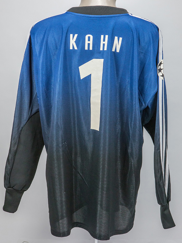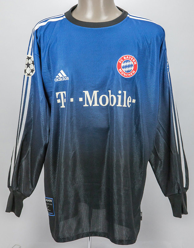 match worn football shirt Bayern Munich 2002/2003 - Original match-worn Bayern Munich goalkeeper shirt with the number 1. Worn by Oliver Kahn in a UEFA Champions League match during the 2002/2003 season. Kahn is a 1996 European Football Champion and 2002 World Cup runner-up. Status: ABB Long-sleeved goalkeeper jersey with arm padding; size XL; flocked club logo; embroidered adidas logo; flocked 'T-Mobile' advertising print; flocked player name and number; with CL Starball patch, CL 4 Trophy patch, and O. Kahn Goalkeeping Badge; jersey has minor signs of wear; adidas. Jersey comes from the collection of a former Bayern Munich coach. Condition: A-