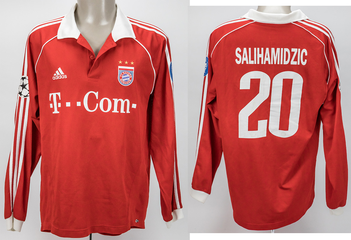 match worn football shirt Bayern Munich 2005/2006 - Original match-worn/issued FC Bayern Munich number 20 jersey. Worn by Hasan Salihamidzic in a UEFA Champions League match during the 2005/2006 season. Salihamidzic is a 42-time capped Bosnia-Herzegovina international, a World Cup winner, and a 2001 Champions League winner. Status: ABC --Short-sleeved jersey with button placket; size XL; embroidered club logo, 3 Champions Stars and adidas logo, rubberized advertising lettering '-T---'; rubberized back number, player name; jersey has signs of wear (back number slightly cracked); with CL Starball patch and UEFA CL 4 Trophy patch; adidas climacool. Condition: A-