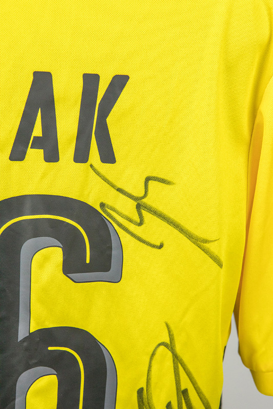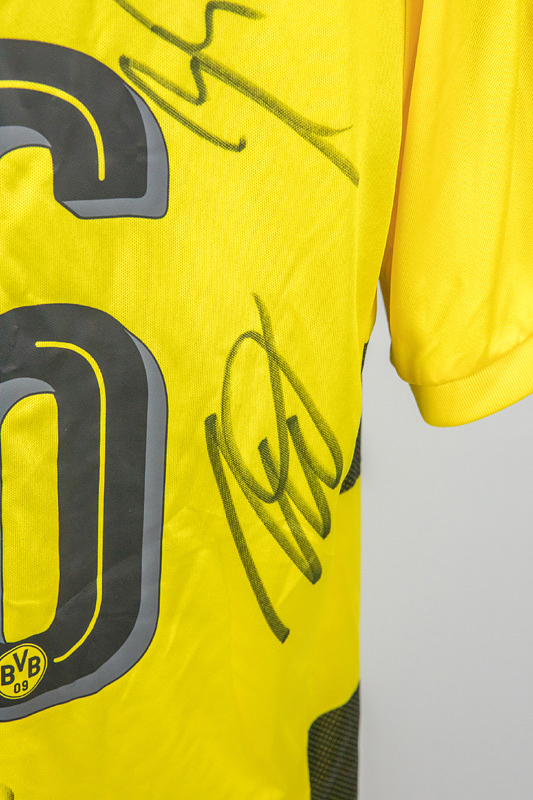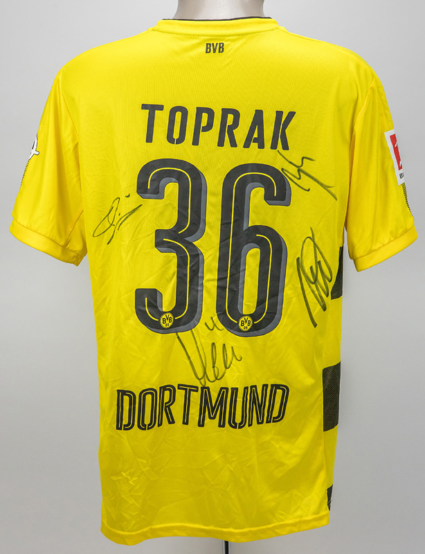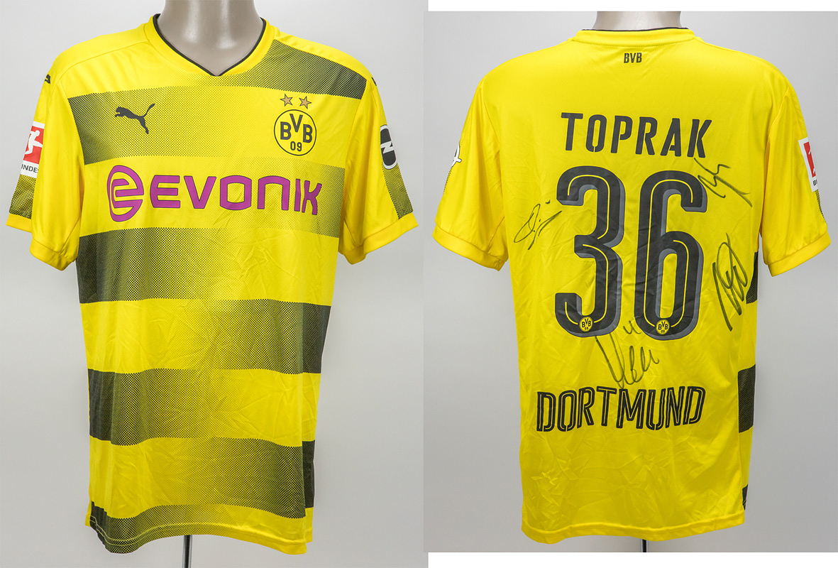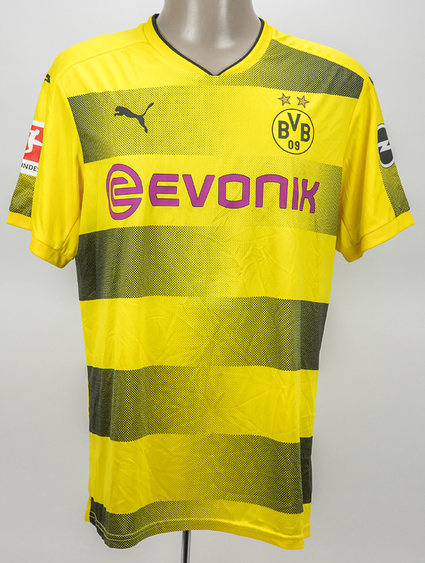 Sorry, no english description is available. ... match worn football shirt Borussia Dortmund 2017 - Condition: A-.....Trikot kurzarm; Größe L; Vereins-Logo, 2 Meistersterne und Puma-Logos gummiert; Werbeaufdruck 'evonik', Rückennummer, Spielername und Schriftzug 'Dortmund' gummiert; Schriftzug 'BVB' auf Kragenrückseite gummiert; mit BL Patch und Opel-Logo Patch; Puma DryCell.