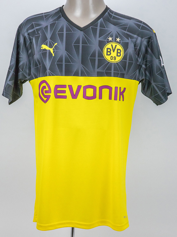 match worn football shirt Borussia Dortmund 2020 - Original match-worn Borussia Dortmund shirt with the number 17. Worn by Erling Haaland on February 4, 2020, in the DFB Cup quarter-final match against SV Werder Bremen. This was Haaland's first appearance in the DFB Cup, and he also scored a goal! Status: AAB --Short-sleeved jersey; size L; gummed club logo, two championship stars, and Puma logos; gummed 'evonik' advertising print, back number, player name, and 'Dortmund' lettering; with DFB Cup trophy patch, Opel logo patch, and 110 years label; Puma DryCell. The jersey comes from a DFB official who was present at the match and took Haald's jersey from the Dortmund locker room after the game. Condition: A