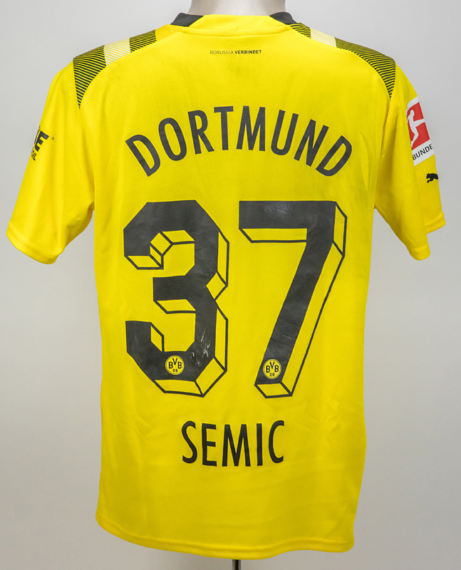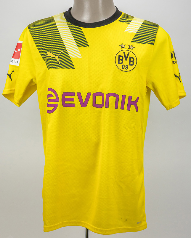 Sorry, no english description is available. ... match worn football shirt Borussia Dortmund 2022 - Condition: A-.....Trikot kurzarm; Größe M; Vereins-Logo, 2 Meistersterne und Puma-Logos gestickt; Werbeaufdruck 'evonik', Rückennummer, Spielername und Schriftzug 'Dortmund' gummiert; Schriftzug 'Borussia verbindet' auf Kragenrückseite gummiert; Trikot ist ungewaschen und hat Gebrauchsspuren (Flecken); mit BL Patch und Rowe Motor Oil Patch; Puma DryCell.