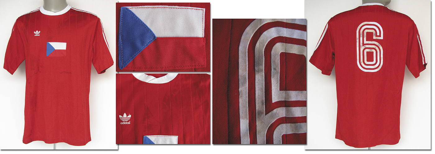 match worn football shirt Czechoslovakia 1982 - Original match worn player jersey from Czechoslovakia with number 6. Worn in the friendly match against Germany on April 14, 1982 in Cologne. Germany - Czechoslovakia 2:1. Exchange jersey directly from the collection of a German national player. Status: AAA --short sleeve jersey; size L; Association logo sewn on; adidas logo printed; flocked back number; Jersey is unwashed and has signs of storage (fouling); adidas. Jersey comes directly from the collection of a German national player who swapped this jersey after the game. Condition: A-
