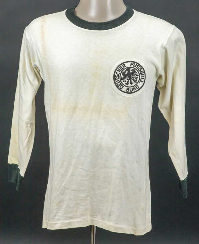 match worn football shirt Germany 1970s - Original match-worn Germany shirt with the number 16. Worn in DFB youth and DFB amateur matches. Erima jersey. Approx. 1972. Status: ACC --Long-sleeved jersey; size M=5/6; DFB logo embroidered and back number sewn on; jersey has signs of wear (stains, yellowed); erima. Condition: B