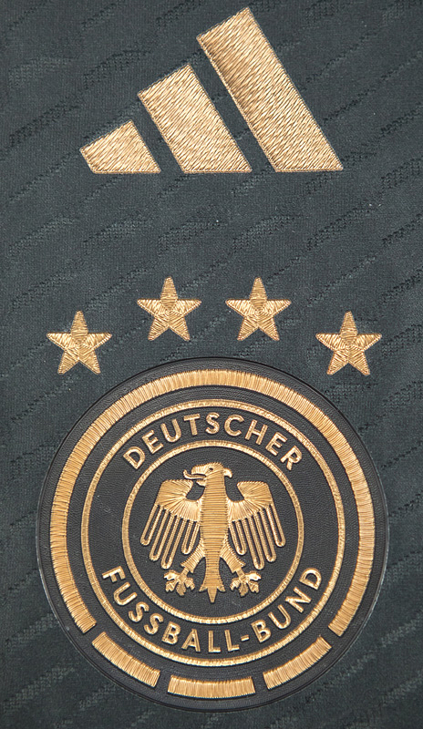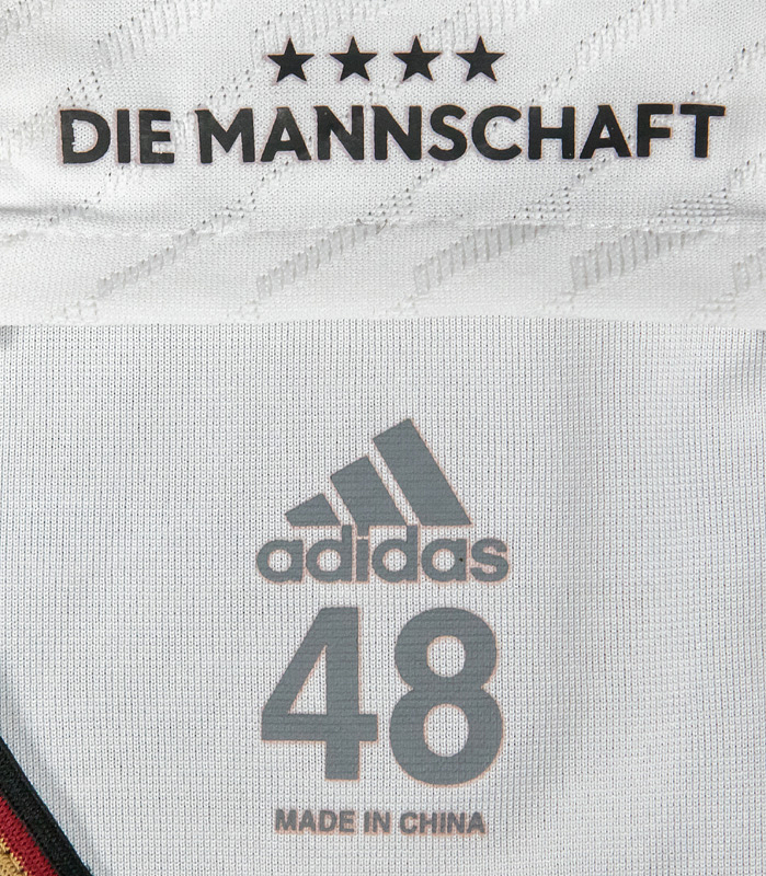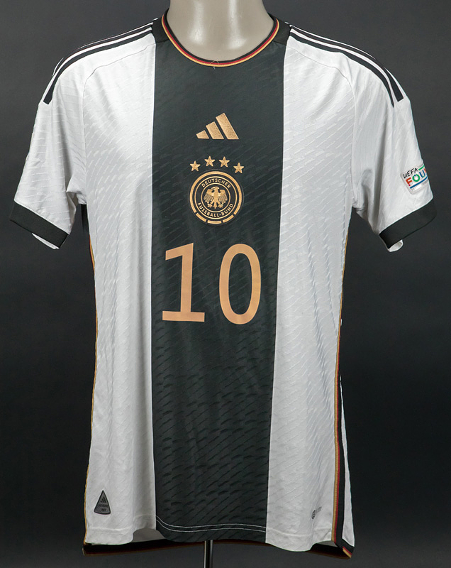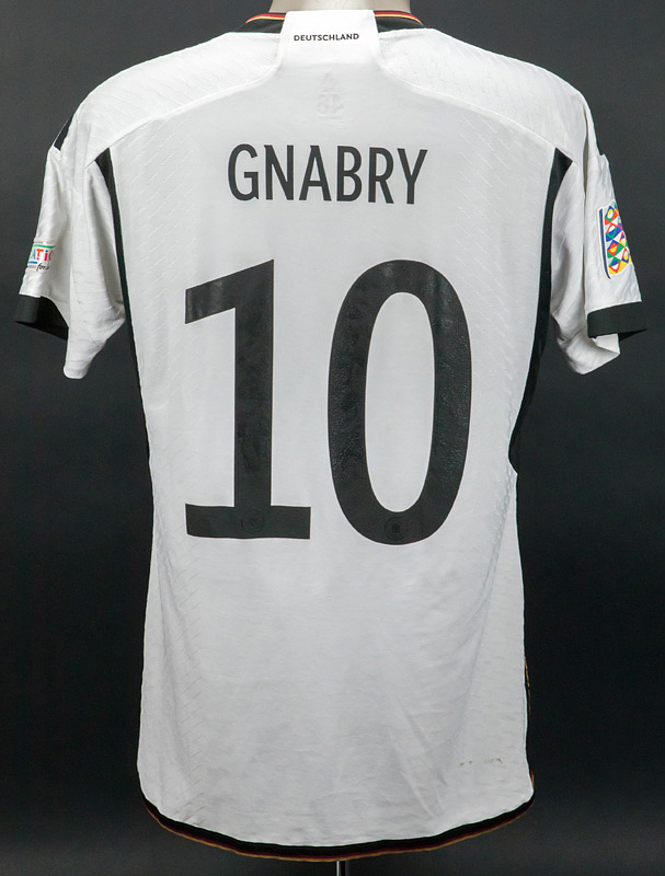 match worn football shirt Germany 2022/2023 - Original match-worn / issued Germany shirt with the number 10. Worn by Serge Gnabry on September 23, 2022, in the Nations League group match against Hungary. Germany - Hungary 0:1. Status: AAB --Short-sleeved jersey; size 48; DFB logo, 4 World Cup stars, and adidas logo rubberized; player name and number (front and back) rubberized; 'Deutschland' lettering on the back of the collar and 'Die Mannschaft' lettering on the inside of the collar rubberized; jersey has signs of wear (stains); with Nations League logo patch and UEFA Foundation for Children patch; adidas Heat.Rdy. Jersey comes from a DFB employee Condition: A-