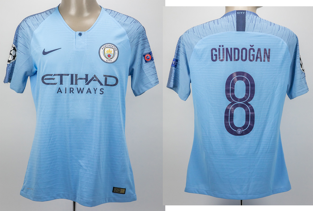match worn football shirt Manchester City 2018/19 - Original match-worn Manchester City shirt with the number 4. Worn by Ilkay Gündogan on March 12, 2019, in the UEFA Champions League round of 16 match against FC Schalke 04. Man City - Schalke 7:0; Gündogan has been capped 82 times by Germany. Exchange jersey. Status: AAA --Short-sleeved jersey with button placket; size L; flocked club logo; embroidered Nike logo; rubberized 'Etihad Airways' advertising print; rubberized back number and player name; rubberized 'City' lettering on the back of the collar; mesh front and back; with CL Starball patch and UEFA Respect patch; Nike Vaporknit. The consignor received this item directly from a Schalke 04 player. Condition: A