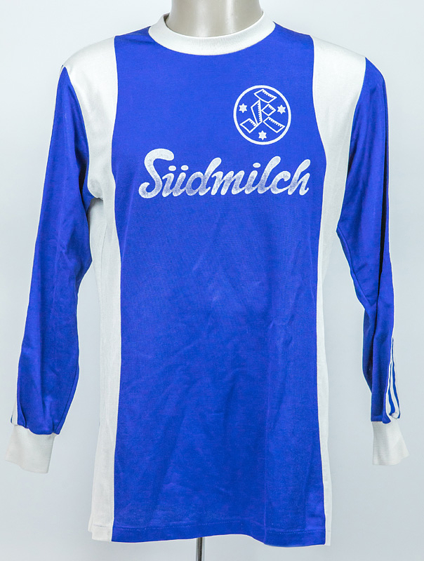 match worn football shirt Stuttgarter Kickers 70s - Original match worn / issued player shirt from the Stuttgarter Kickers with the number 13. Worn by Werner Weist in a match of the 2. Bundesliga in the 1977 / 1978 season. Status: ABA. --Long-sleeved Adidas/Erima jersey; size 7/8; club logo, Südmilch advertising, back number, and club name, all applied using the wet flocking process; jersey has been washed several times! --Jersey comes directly from the Werner Weist collection (1949-2019) - Borussia Dortmund 1968 - 1971 (72/34), Werder Bremen 1971-1977 (145/33), Stuttgarter Kickers (1977-1978; 10/1); 3x DFB U-23 1970 + 1971). The buyer receives a certificate of authenticity and confirmation from the Weist family regarding the origin of the pieces. Condition: A-B