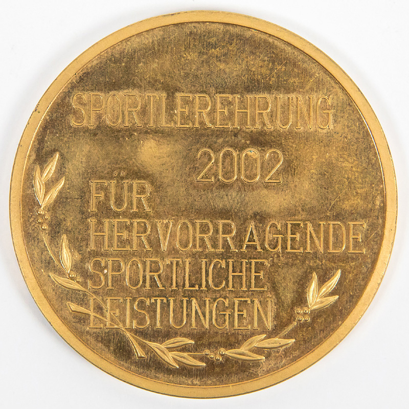 Oliver Kahn medal of honour 2002 German football - Official medal of honor from the city of Munich for Oliver Kahn with the inscription “Sports Honor 2002 for outstanding sporting achievements”. Tombac, gold-plated, 5 cm The medal was awarded for sporting achievements in 2001, the year in which Bayern Munich won the World Cup, the Champions League and the German Championship with Oliver Kahn! --Around 2010, a well-known collector from Munich acquired this medal from Oliver Kahn's family circle. Condition: A-