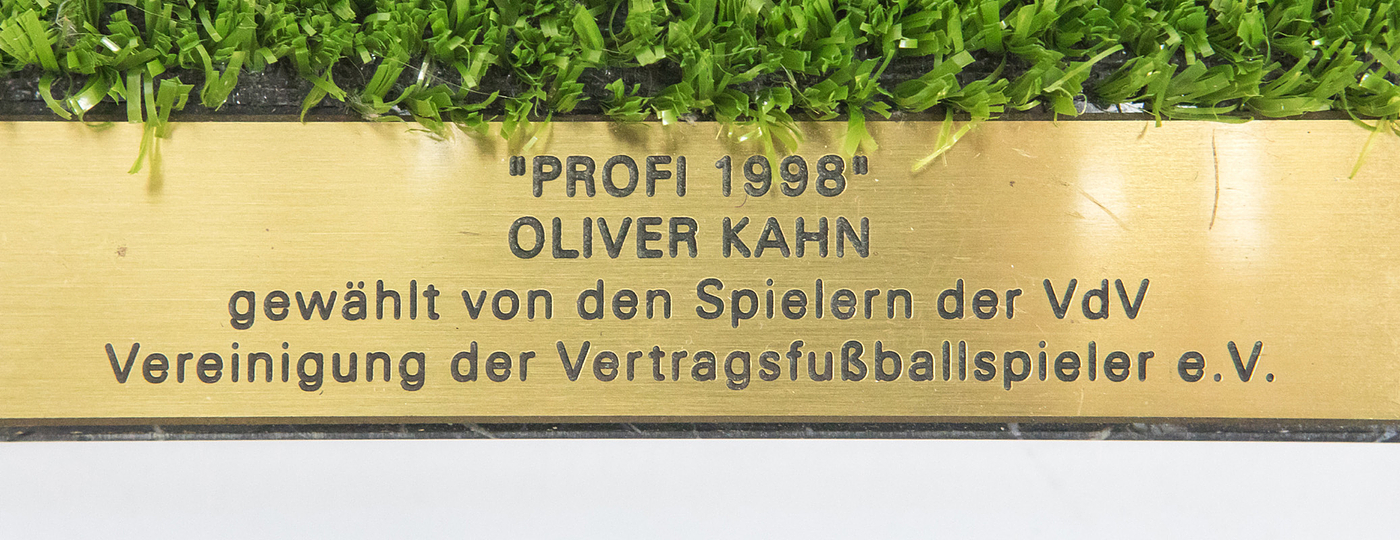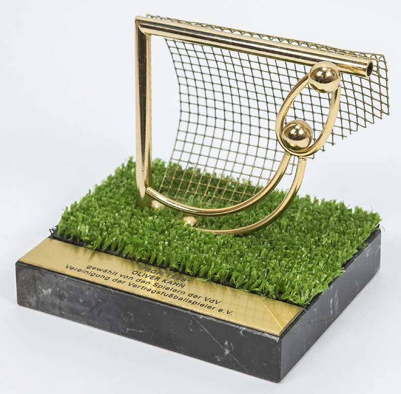 Oliver Kahn sculpture Profi of the year 1998 - Honorary Award Professional 1998 from the Association of Contractual Football Players (VdV) for Oliver Kahn. Sculpture made of gold-plated stainless steel (football goalkeeper in a parade in front of a football goal), with artificial turf on a marble base, 18x14x17 cm Weight: 2.2 kg. With mounted engraved brass plaque "Professional 1998 Oliver Kahn elected by the players of the VdV Association of Contract Football Players. This prize was awarded for the first time in 1998! --Members of the VdV are professional footballers in the Bundesliga who voted for the “Professional of the Year” from 1998 to 2003; from 2005 to 2008 this award was called Player of the Year. As of 2008, such honors are only available as "11 of the Year". Oliver Kahn was again voted “Professional of the Year” in 2001. Around 2010, a well-known collector from Munich acquired this medal from Oliver Kahn's family circle. Condition: A-