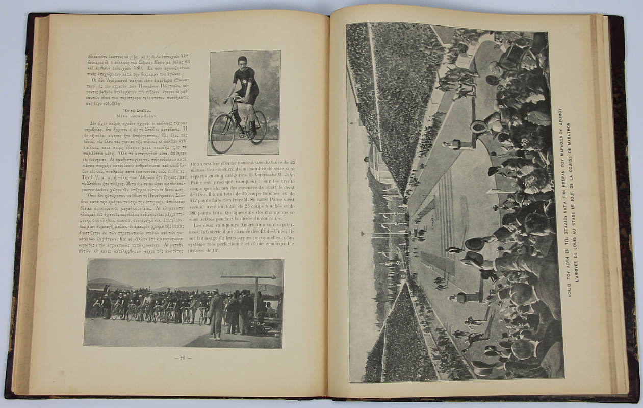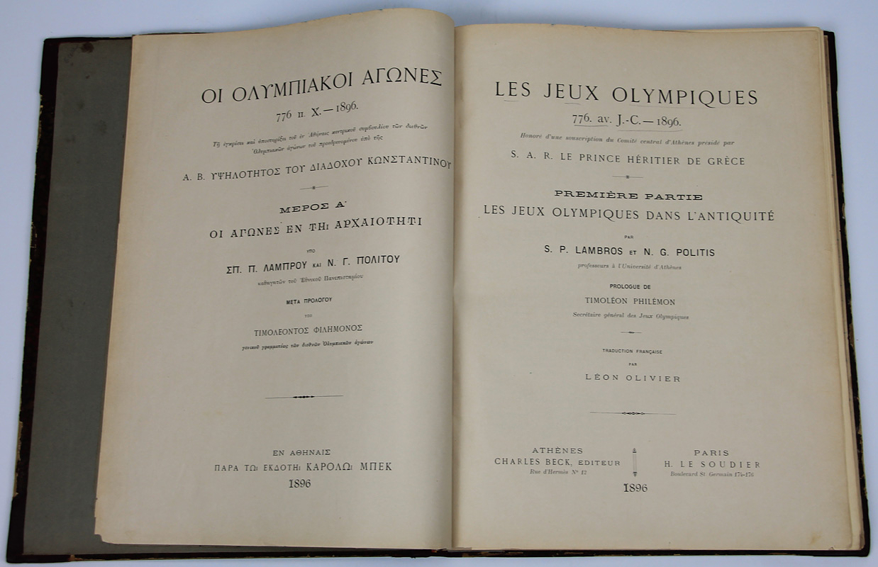 Olympic Games 1896 Official Report Part 1+ 2 - LES JEUX OLYMPIQUES 776 av. J.-C. -. 1896 - DEUXIÈME PARTIE - LES JEUX OLYMPIQUES DE 1896 (Official Report). A modern handmade slipcase for this copy! 220 pages (100 + 110 pages), 26x32 cm, leather, numerous photos, Beck, Athens 1896. --French-Greek original edition of the Official Report of the first Olympic Games in 1896. Volume II: The Olympic Games in 1896. Comprehensive documentation of the first modern Olympic Games with numerous historical photos and some color illustrations. Complete documentation of the 1896 Olympic Games. Volume 1 describes only the ancient, pre-Christian Olympic Games. -- Overall, a good copy of this first Official Report!!! Condition: C