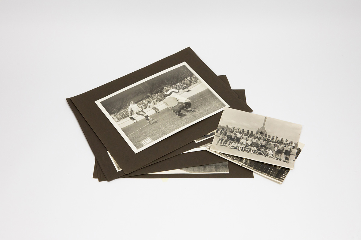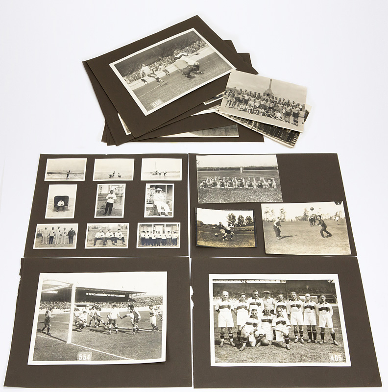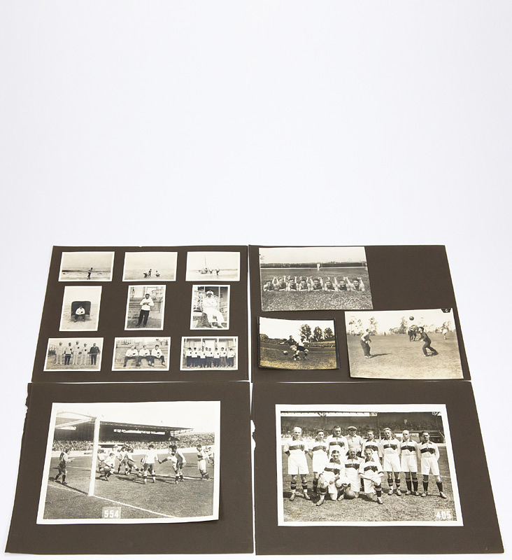 Olympic Games 1928 Football Collection 43 Fotos - Photo collection with 43 B/W photos of the German national player Wiggerl Hofmann (FC Bayern Munich) from the DFB's participation in the 1928 Olympic Games and from the German national team's preparations for this tournament. 18 B/W press photos 24x18 cm to 12x9 cm and 25 private photos of the players from Holland of the national players' leisure activities away from the Olympic Games in Amsterdam in 1928, each 8.5x6 cm --Great collection that documents the Olympic football tournament Amsterdam 1928 from the perspective of the players and with impressive press photos. There are also photos of the DFB's Olympic course from 1927 and photos of preparation games. The pictures are mounted on cardboard -- from the original photo album of Bayern Munich football legend Ludwig "Wiggerl" Hofmann (1900-1935). He played for FC Bayern from 1916 to 1933. In 1934/35 he was briefly coach of Bayern. He played 18 times for the DFB national team from 1926-31. The original photo album was auctioned at AGON auctions in December 2017. Condition: A-B