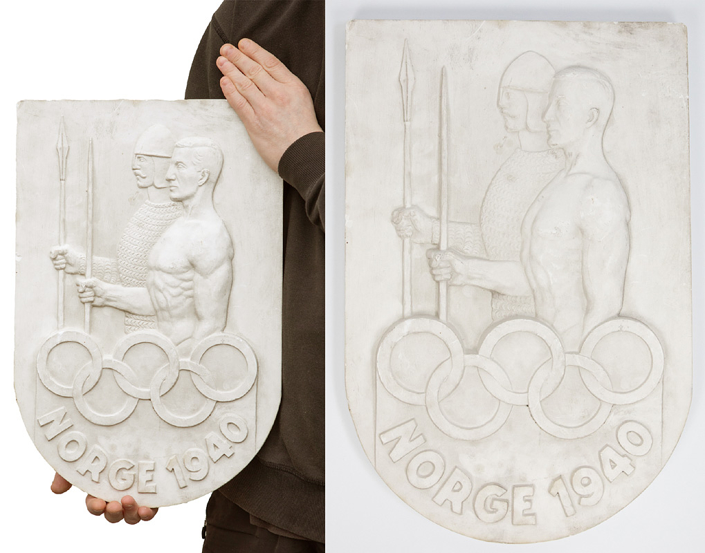 Olympic Games 1940 Norwegian plaque 48x32 cm - Original mold for a large version of the Norwegian donation plaque for the 1940 Helsinki Olympic Games with the inscription "Norge 1940". Plaster, weight: 3.5 kg. 48x32x2.3cm. --The large version of this plaque was intended to be produced for promotional purposes to raise awareness of fundraising for Norway's Olympic team for the 1940 Olympic Games. It is not known whether this large version was implemented. The small donation plaque that was issued is made of aluminum and measures 6.9x4.6 cm. --Small edge chips; slightly dirty. Condition: C+