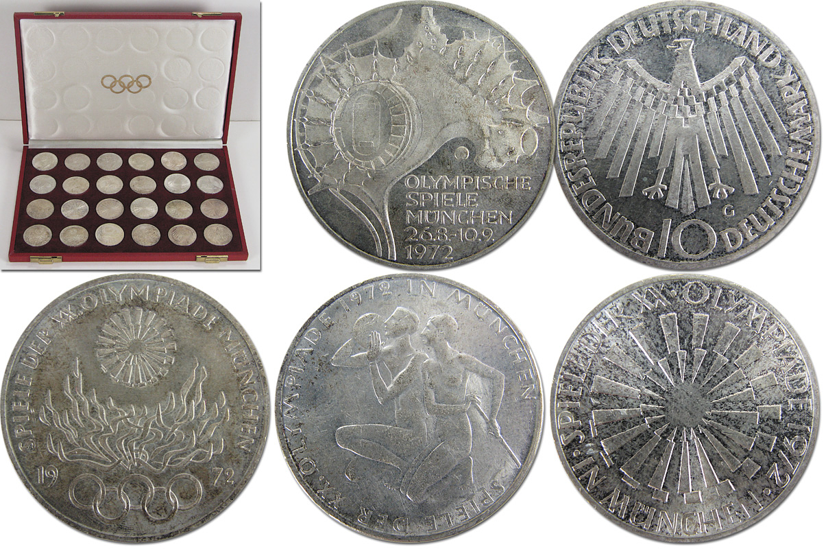 Olympic Games 1972. 10 Deutsch-Mark Coins - 24 10 German Mark coins (6 different motives) on occasion of the Olympi Games in Munich 1972. Sum up to 240,- German Mark. In original case (26 x 18 cm). The edges of the coins bear the etching „Citus Altius Fortius“ and were embossed in 1972. Metal: Ag (silver) 625; Cu (brass) 375. Size: 3.2 cm each, Official means of payment. Partly tarnished. Condition: A