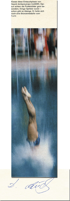 Sorry, no english description is available. ... Olympic Games 1980 Autograph diving USSR - Condition: A-.....Selten! Dabei Farbmagazinfoto (27x6,5 cm).