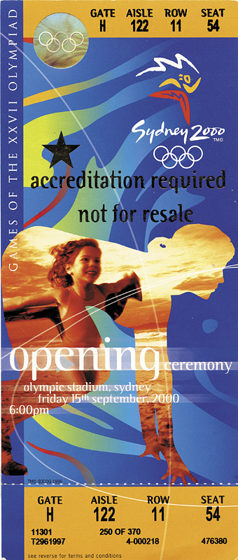 Olympic Games 2000. Ticket Opening Ceremony - in Sydney for IOC-members on September 15th. Size 9.5x22 cm. Condition: A