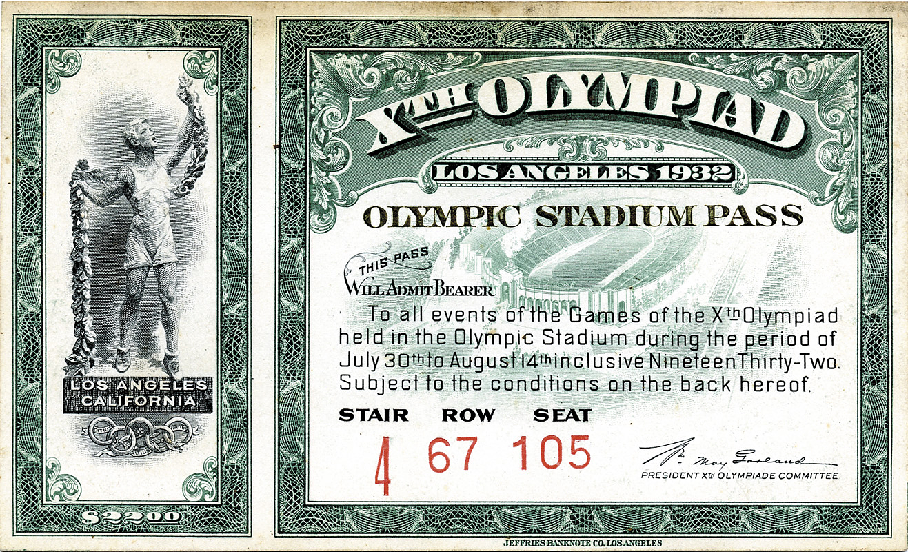 Olympic Games Los Angele 1932 Ticket Stadium Pass - „Olympic Stadium Pass: allowing entry to all events of the games of the Xth Olympiad held in the Olympic Stadium...“ Size 14..5x8.5 cm, --Some spots Condition: A-
