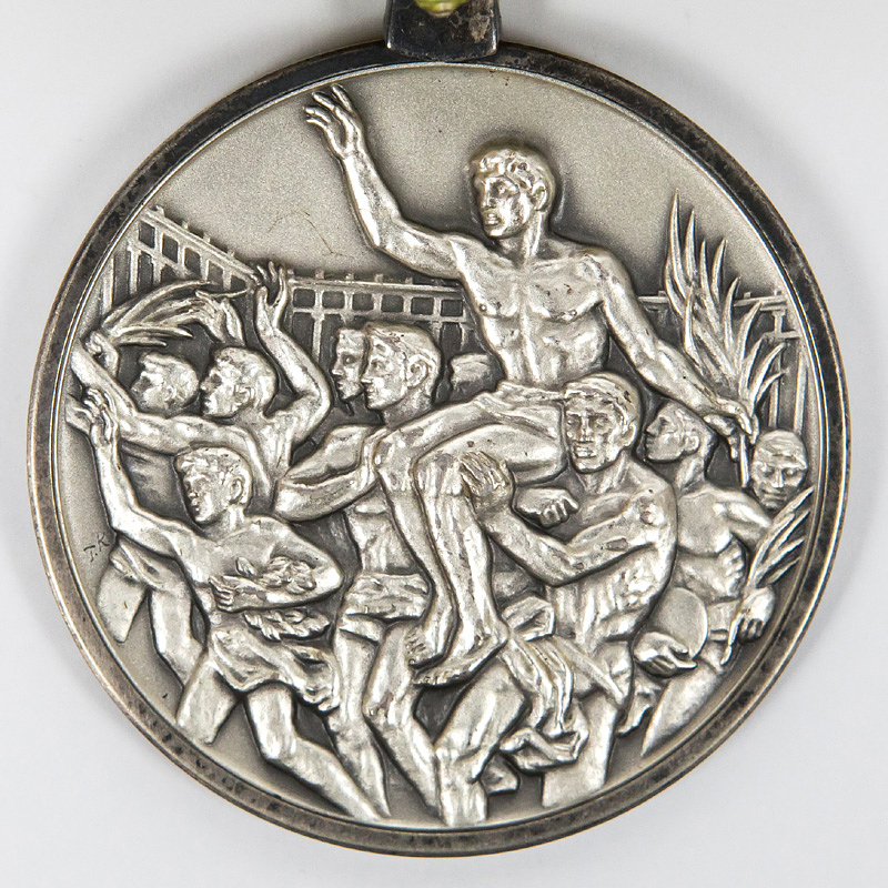 Olympic Games Mexico 1964 Silver Winner medal - Official silver medal of a Russian gymnast (URS) for second place at the 1964 Summer Olympics in Tokyo. Silver (102.6 grams), 6.3 cm, with the inscription "XVII Olympiad Tokyo 1964 Gymnastics." With original multicolored silk ribbon and silk rosette. Condition:
