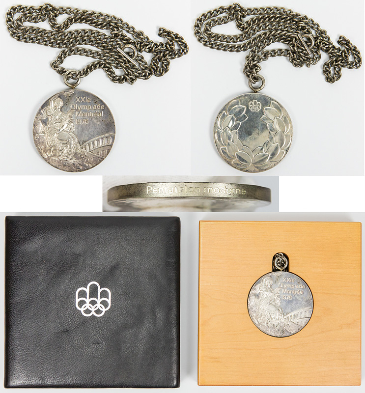 Olympic Games Montreal 1976. Silver medal - Original silver medal from the Montreal 1976 Olympic Games for second place in the modern pentathlon by Pavel Lednev (1943-2010; USSR). With “Penthatlon moderne” engraving on the edge. Silver (148 grams), 6 cm with original eyelet and original chain. In the original leather wooden case (15.5x15.5x3.5 cm). --The consignor received this medal around 2000 directly from the legend of the modern pentathlon Pavel Lednev. Lednev won 7 individual and team medals from 1968 - 1980, including 2 gold medals with the USSR team in 1972 and 1980. --Medal slightly tarnished Condition: A-