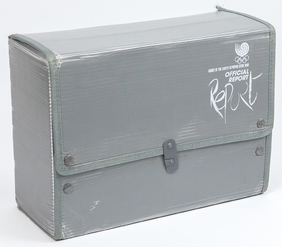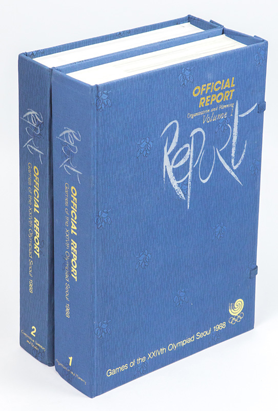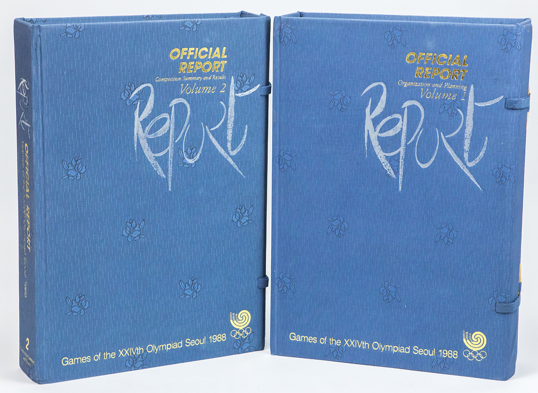 Olympic Games Seoul 1988 Official Report Englisch - Edition. 2 Volumes. 800 pages, 39x28 cm. Decorative silk cover, gold embossed. In original plastic case (case shows signs of use). Condition: A-B