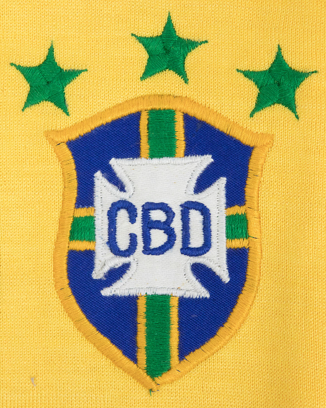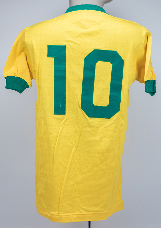 original football shirt Brazil, Pele signed 1971 - Original Brazil player jersey with the number 10. With Pele's original autograph "do amigo Pele" on the front. The jersey was signed in 1971! --Short-sleeved jersey; size approx. L; embroidered federation logo, three championship stars, and back number; Athleta. Pele gave original signed Brazilian national team jerseys to good friends or on special occasions. Most of these jerseys were given away by him on the occasion of his farewell game in 1971. A very fine piece from one of the best and most popular players in football history. --From the collection of a journalist who knew Pele personally since 1957! Condition: A-