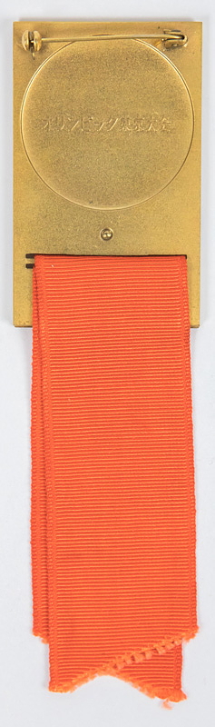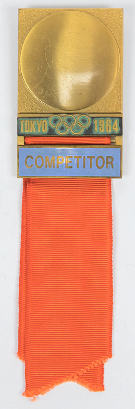 Participation Badge: Olympic Games 1964. - Official participation badge Tokyo 1964 "Competitor" (Athlet) for shooting. Bronze, gold plated, Writing bar light blue enamelled. Orange silk ribbon. 6,1x3,8 cm. (Elbel 1964-S-124) Condition: A