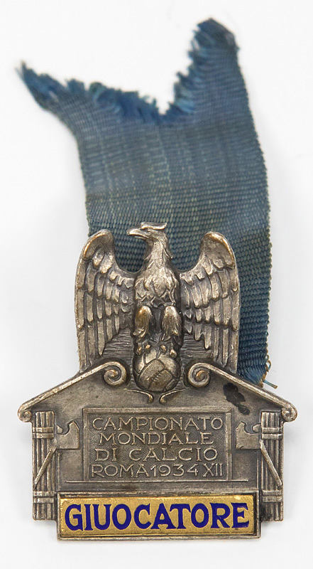 Participation Badge: World Cup 1934. Player - Numbered official badge "4", „Giuocatore“(Player), bronze, silvered, lettering in blue enamel, made by Picchiani, Barlacchi, Firenze.Size 4.3x3.6 cm. With blue silkribbon --tarnished; silk ribbon fadded Condition: A-B
