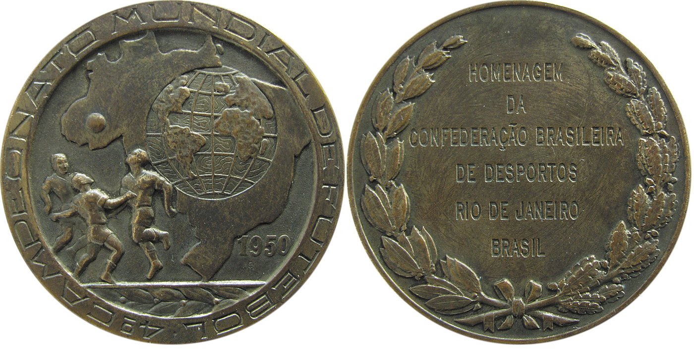 Participation Medal: World Cup 1950. - Participation medal: World Cup in Brazil 1950."4° CAMPEONATO MUNDIAL DE FUTBOL 1950". Official medal engraved on the rear "Homenagem da Confederacao Brasileira de Desportos Rio de Janeiro Brasil". Bronze, size 6.1cm, 114grammes, a very rare, well kept, excellent item! Condition: A