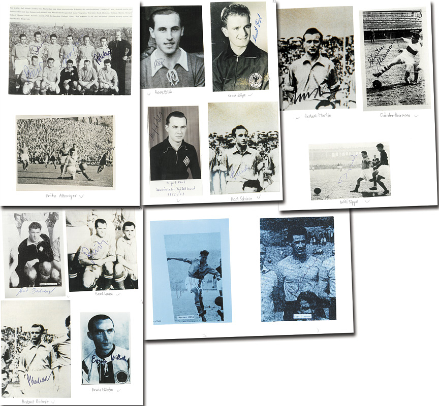 Sorry, no english description is available. ... Saarland Autograph colletction of Internationals - Condition: A-B.....Das Saarland war von 1950 bis 1956 eigenständiges Mitglied der FIFA und bestritt in dieser Zeit 19 Länderspiele (unter anderem WM-Qualifiktion für die WM 1954). Es wurden insgsamt 42 Spieler in diesen Länderspielen eingesetzt. Diese Sammlung enthält 15 Nationalspieler auf 15 Spielerbelegen Dabei folgende Spieler: 2x Lauck, Altmeyer, G.Herrmann; M.Ebert, W.Otto, 2x Clemens, 2x Binkert, Bild, 2x H.Martin, 2x Borcherding, Schira, W.Sippel, E.Wilhelm, Zägel. Interessante Sammlung!!!.