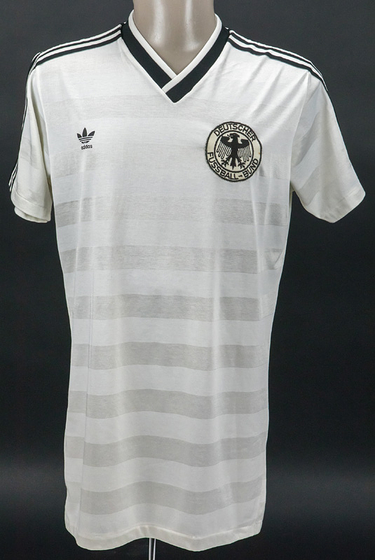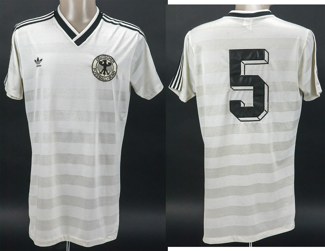 UEFA EURO 1984 match worn football shirt Germany - Original match-worn Germany shirt with the number 5. Worn by Bernd Förster in a 1984 UEFA European Football Championship match for the German national team; Förster is a 1980 European Football Championship Champion and 1982 FIFA World Cup runner-up. Status: ABB --Short-sleeved jersey; size 7/8; DFB logo sewn on; adidas logo printed; back number thickly rubberized; jersey shows signs of wear (back number slightly cracked), adidas. Jersey comes from the collection of a former DFB official. Condition: A-