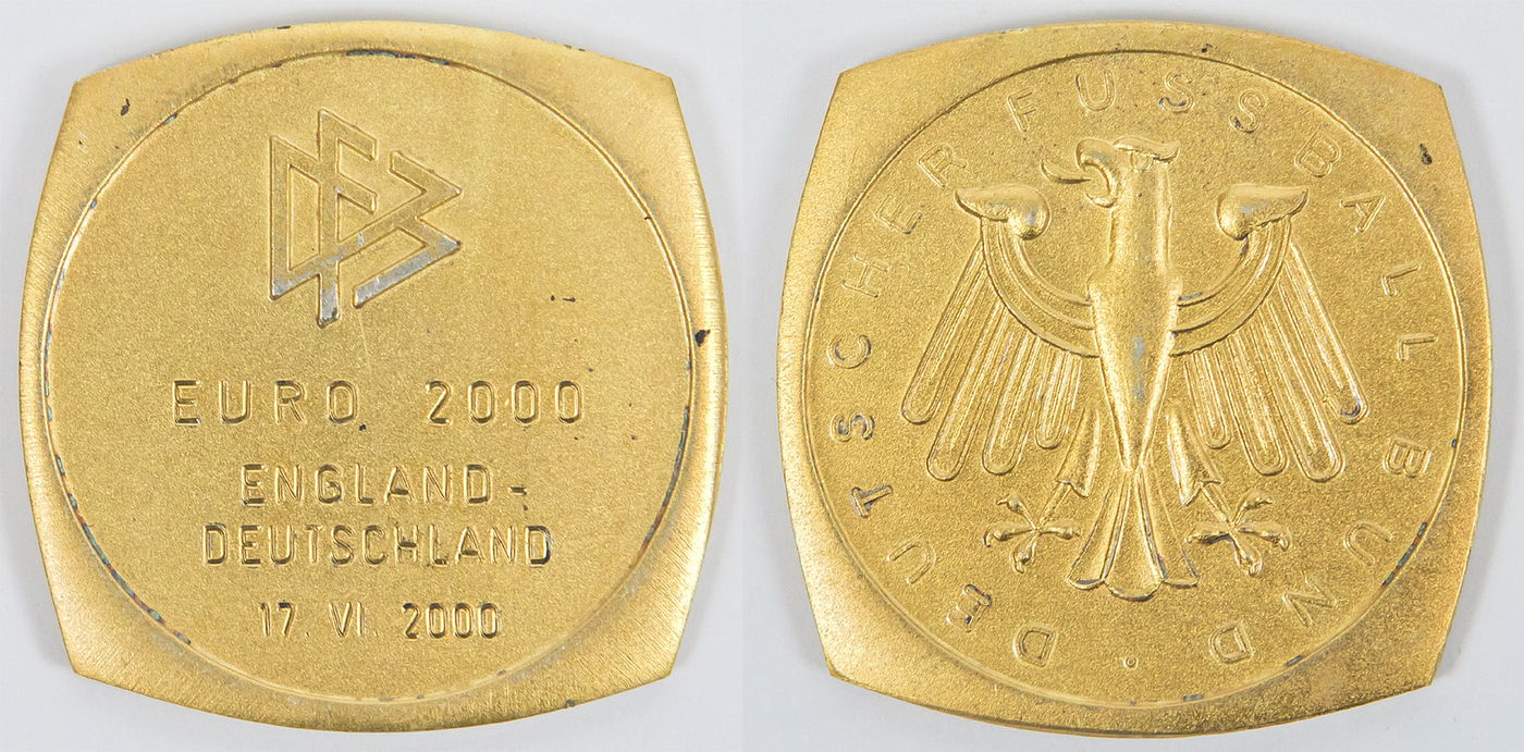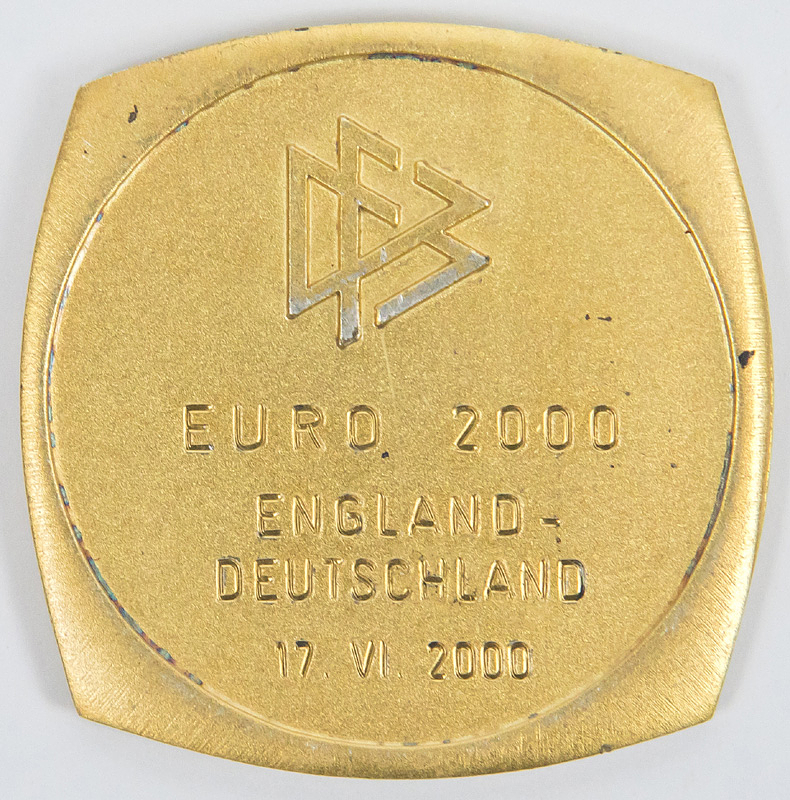 UEFA Euro 2000 Medal England v Germany Kahn - Official DFB international medals for Oliver Kahn for his participation in the UEFA Euro 2000 game England v Germany on June 12, 2000. Tombak, gold plated. 4.2x4.2cm. --Around 2010, a well-known collector from Munich acquired this medal from Oliver Kahn's family circle. Condition: A