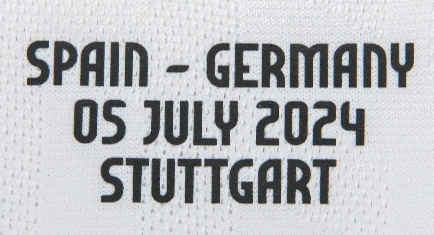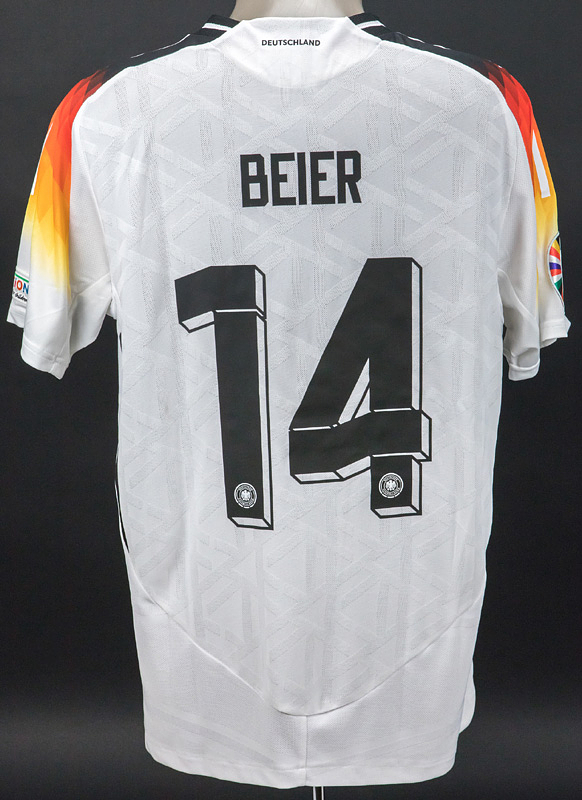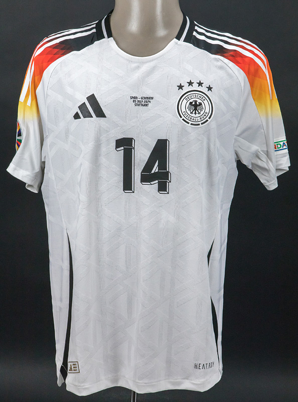 UEFA Euro 2024 match issue football shirt Germany - Original match-issued Germany jersey with number 14. Assisted by Maximilian Beier (did not play) on July 5, 2024, in the quarterfinals of the European Football Championship against Spain. Spain - Germany 2:1 aet. Status: AAB --Short-sleeved jersey; size L; DFB logo, 4 World Cup stars, and adidas logo rubberized; match details, player name, and number (front and back) rubberized; 'Deutschland' lettering on the back of the collar rubberized; jersey with UEFA Euro 2024 Trophy patch and UEFA Foundation for Children patch; adidas Heat.Rdy. Jersey comes from a DFB official Condition: A