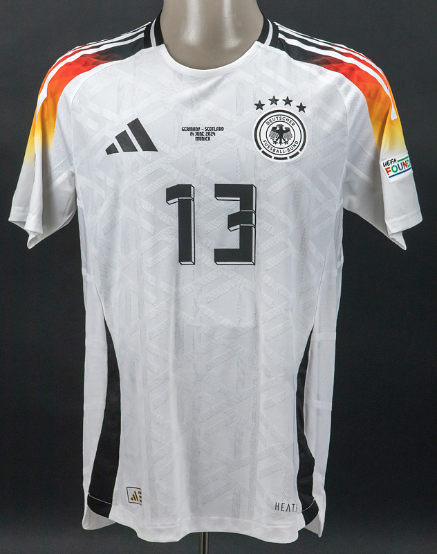 UEFA Euro 2024 match issue football shirt Germany - Original match-issued Germany player shirt with the number 13. Designed for Thomas Müller on June 14, 2024, in a European Football Championship group match against Scotland. Germany won 5-1 against Scotland. Thomas Müller is the 2014 FIFA World Cup winner. Status: AAB --Short-sleeved jersey; size M; DFB logo, 4 World Cup stars, and adidas logo rubberized; match details, player name, and number (front and back) rubberized; 'Deutschland' lettering rubberized on the back of the collar; jersey with UEFA Euro 2024 Trophy patch and UEFA Foundation for Children patch; adidas Heat.Rdy. Jersey comes from a DFB kidman Condition: A