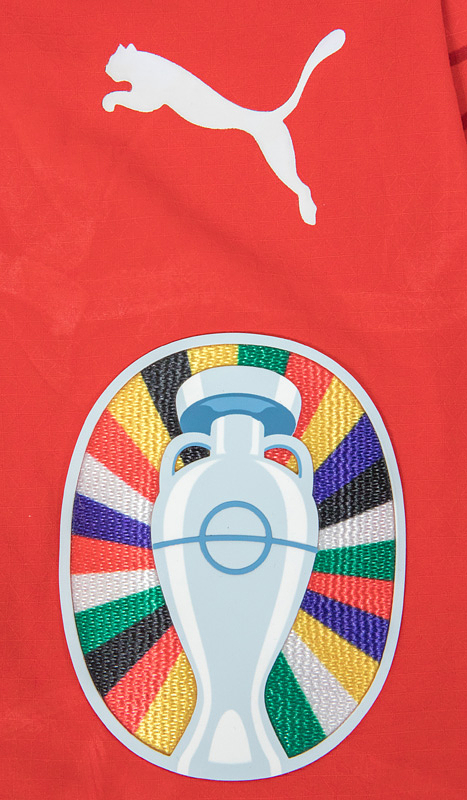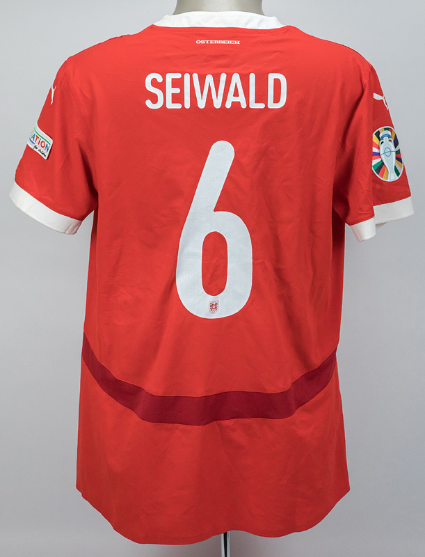 UEFA Euro 2024 match worn football shirt Austria - Original match-worn Austria shirt with the number 6. Worn by Nicolas Seiwald on July 2, 2024, in the round of 16 of the European Football Championship against Turkey. Austria - Türkiye 1:2. Status: AAB --Short-sleeved jersey; size M; rubberized federation logo, match details, and Puma logos; rubberized player name and number (front and back); rubberized 'Österreich' lettering on the back of the collar; partially welded seams; jersey with signs of wear (UEFA Foundation patch is loose by about 4 cm, stains on the sleeve); with UEFA Euro 2024 Trophy patch and UEFA Foundation for Children patch; Puma Ultraweave. Jersey comes from an employee of the Austrian Football Association. Condition: A-